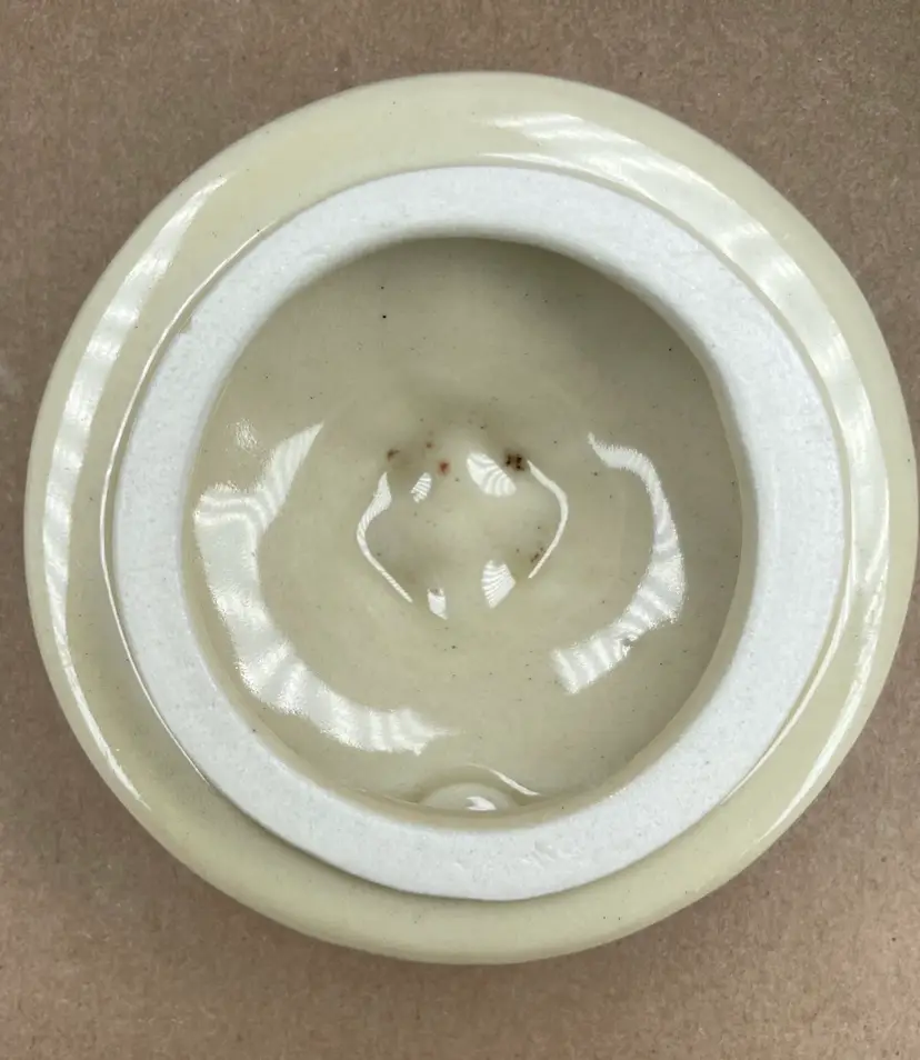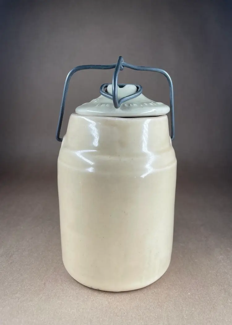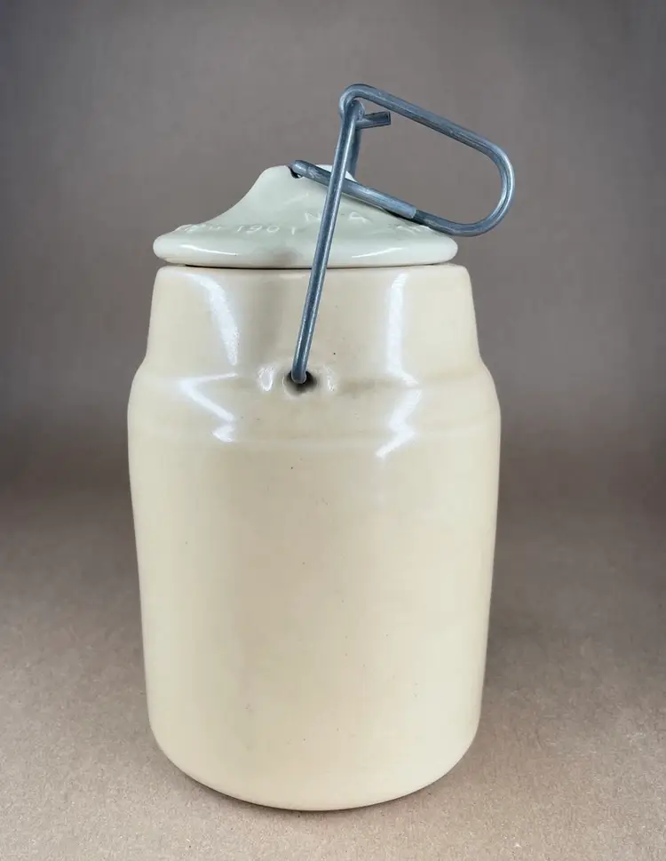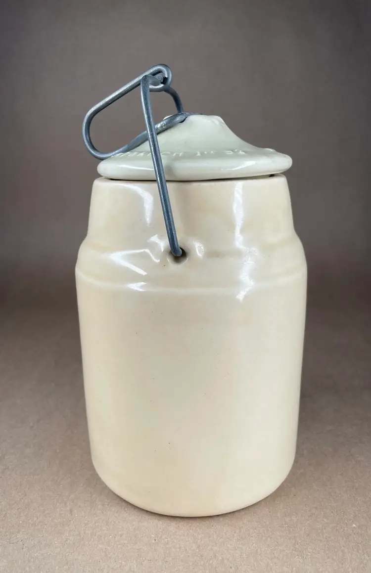 See photos for condition and measurements. Lid closely tightly. Crazing inside the crock.