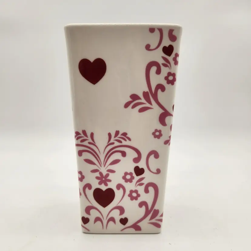 Give your love something to treasure when the flowers have wilted - this beautiful heart-filled vase. It stands 7 1/2" tall and has a square rim measuring 4" x 4" inches tapering down to 3" x 3" at the base- perfect for a beautiful, full bouquet! Like New Condition: no chips, or cracks. Keywords: vase, heart, floral, decorative, tabletop, gift, centerpiece, ceramic, accent, romantic, sweetheart