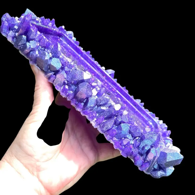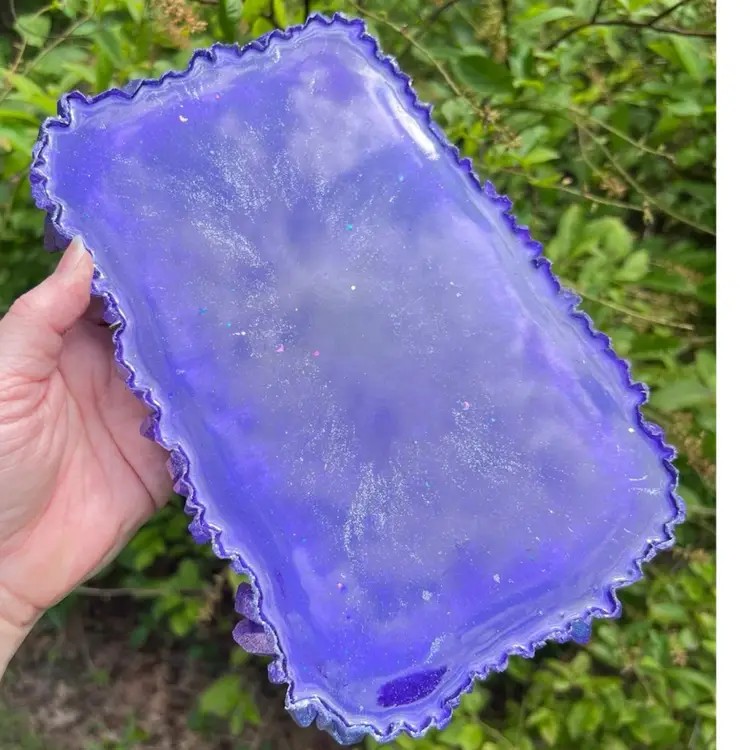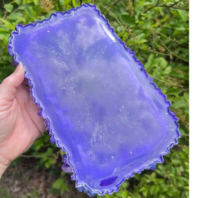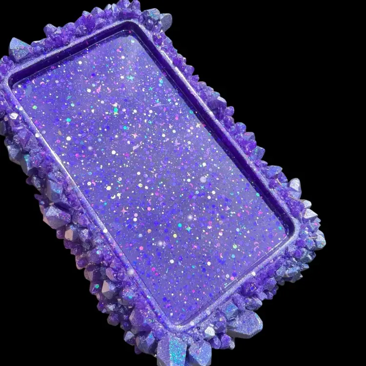 Handmade by me! Vibrant purple pigment and sparkly glitter. Made using high temp strong resin. Yes, even the “crystal edge” is resin! Size: 9-3/4” length x 6-1/2” width x 2” height at tallest crystals. Tray depth is 3/8”. Weighs 22 ounces
