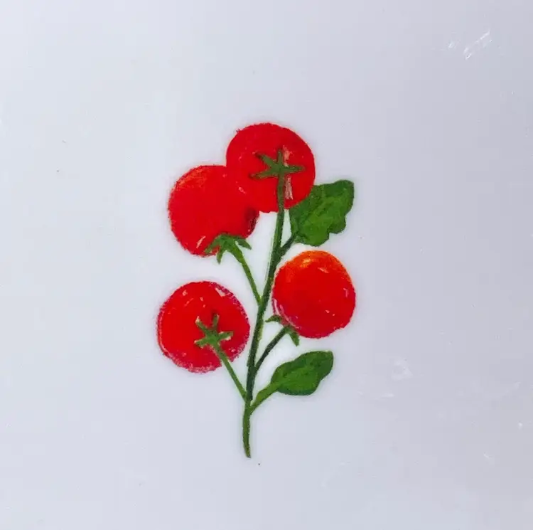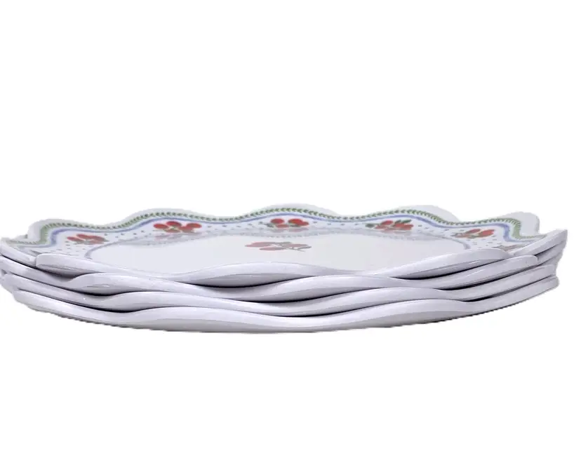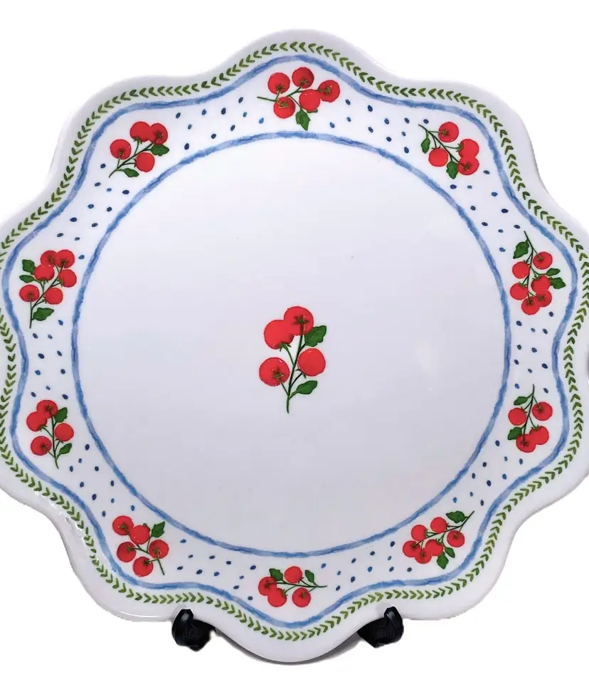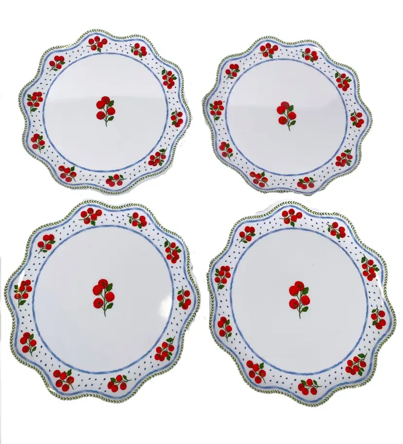 New set of 4 Rachel Ashwell "The Farmhouse" melamine side plates. They have country farmhouse aesthetic with cherry tomatoes design, blue polka dots, green leaf and blue borders along the rim, inner blue border, scalloped edge. Measures approx. 8.25" in diameter. Great for serving snacks, desserts, appetizers, etc. 100% chip and break resistant Melamine. Dishwasher safe. Not for microwave, oven or stove. This set is new - out of box.