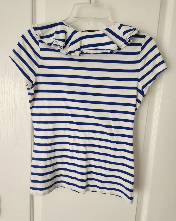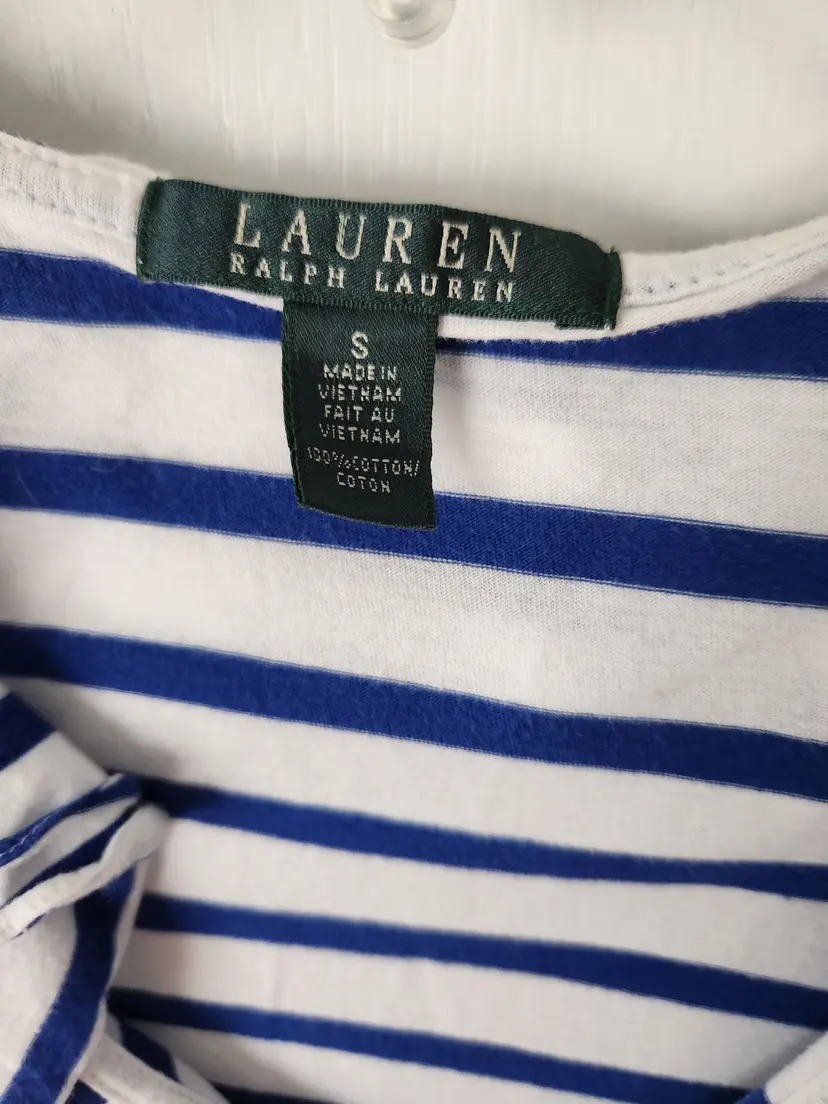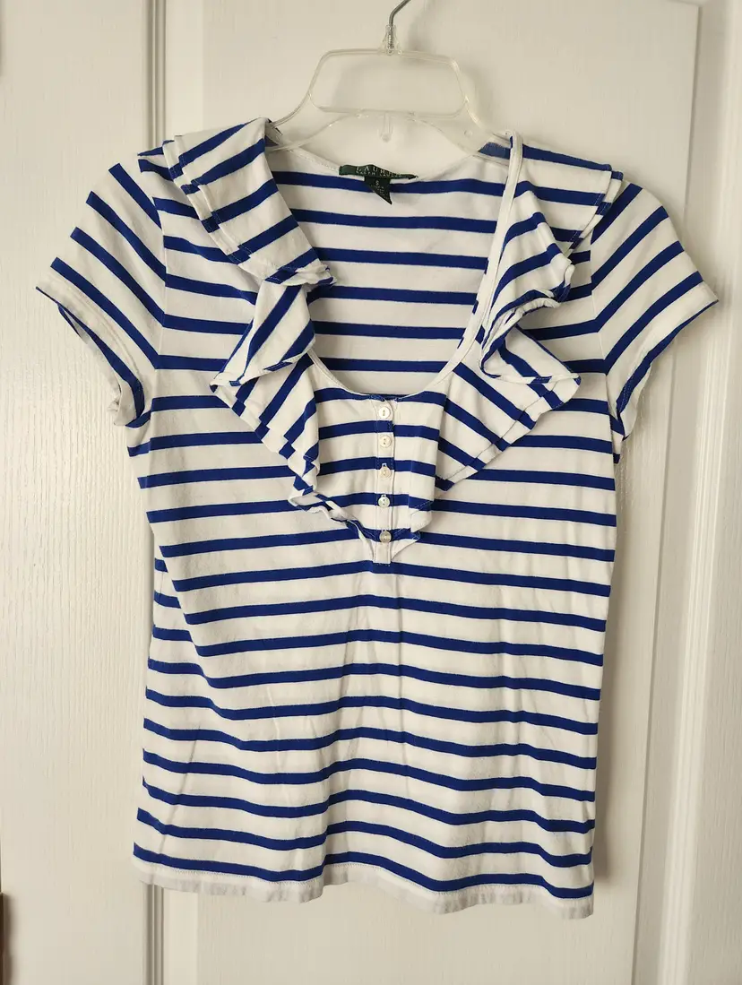 Ralph Lauren size small. This is so cute. It is white with blue horizontal stripes. The collar is ruffled. There are five small buttons on the front and has cap sleeves. It is made of 100% cotton. Very soft and comfortable. Great condition. Measurements: Pit to pit-17 inches Length-21 1/2 inches