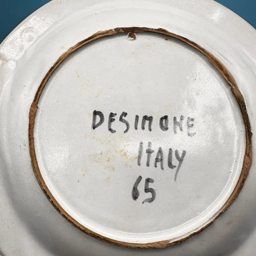 Rare and hard to find Giovanni De Simone, (MCM) hand-painted art pottery goat or donkey under a sun signed "Desimone Italy 65" plate. Approximately 9 5/8 inches in diameter. Hand-crafted Italian maiolica ceramic with a visible hand-painted glaze. Produced in Italy in 1965, as indicated by the "65" signature alongside the artist's name.