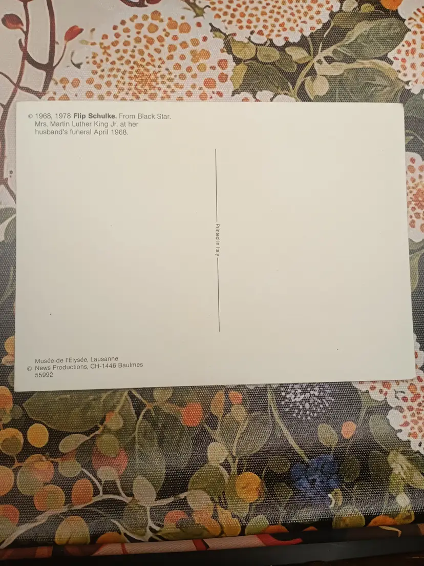 Hi this is a stunning rare postcard of Coretta Scott King at Martin Luther King Jr.'s funeral. It is in wonderful vintage condition. It measures 6 inches x 4inches. Please let me know if you have any questions.
