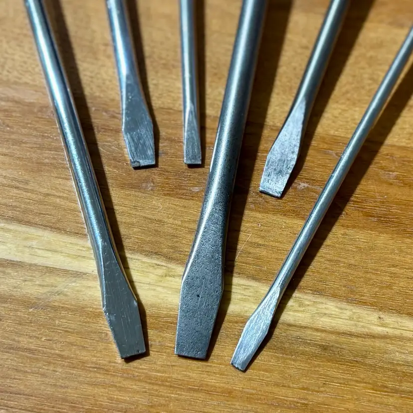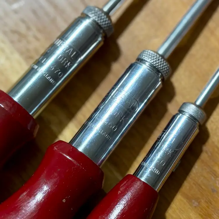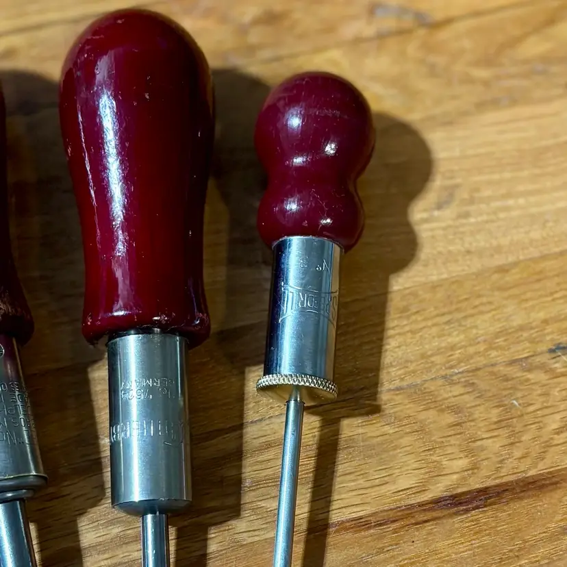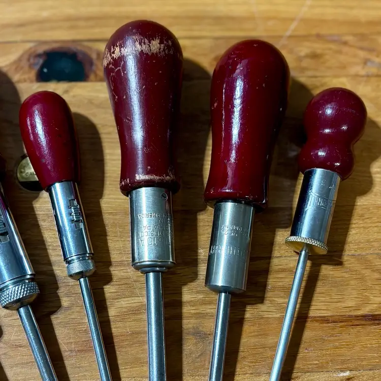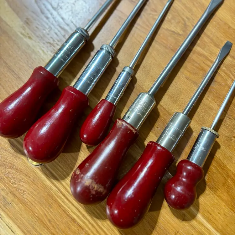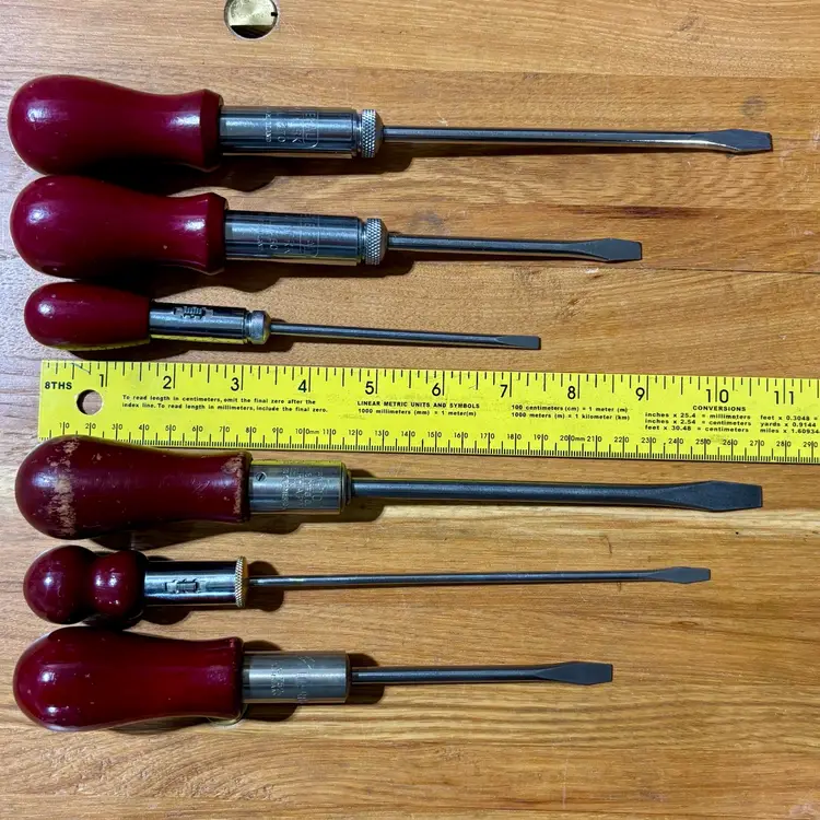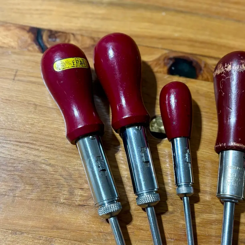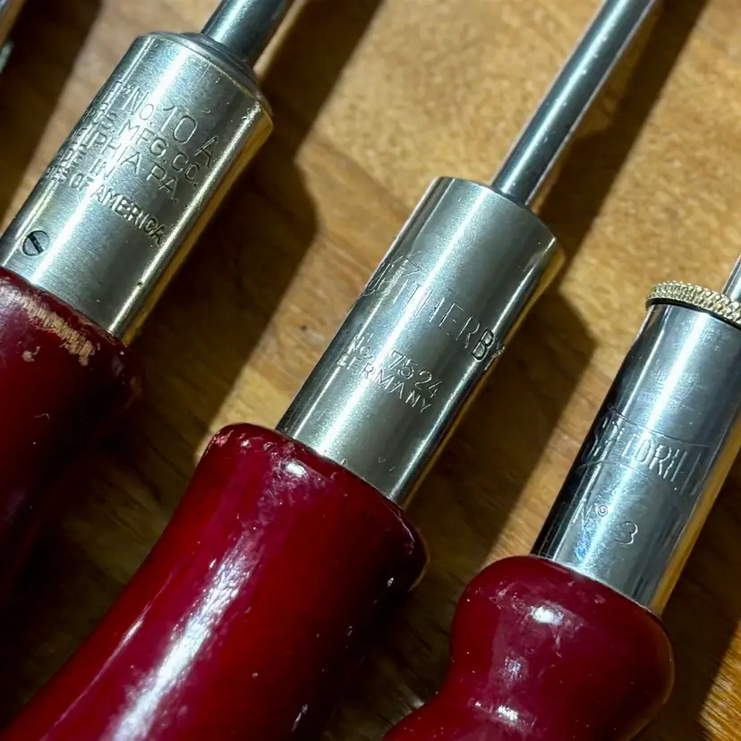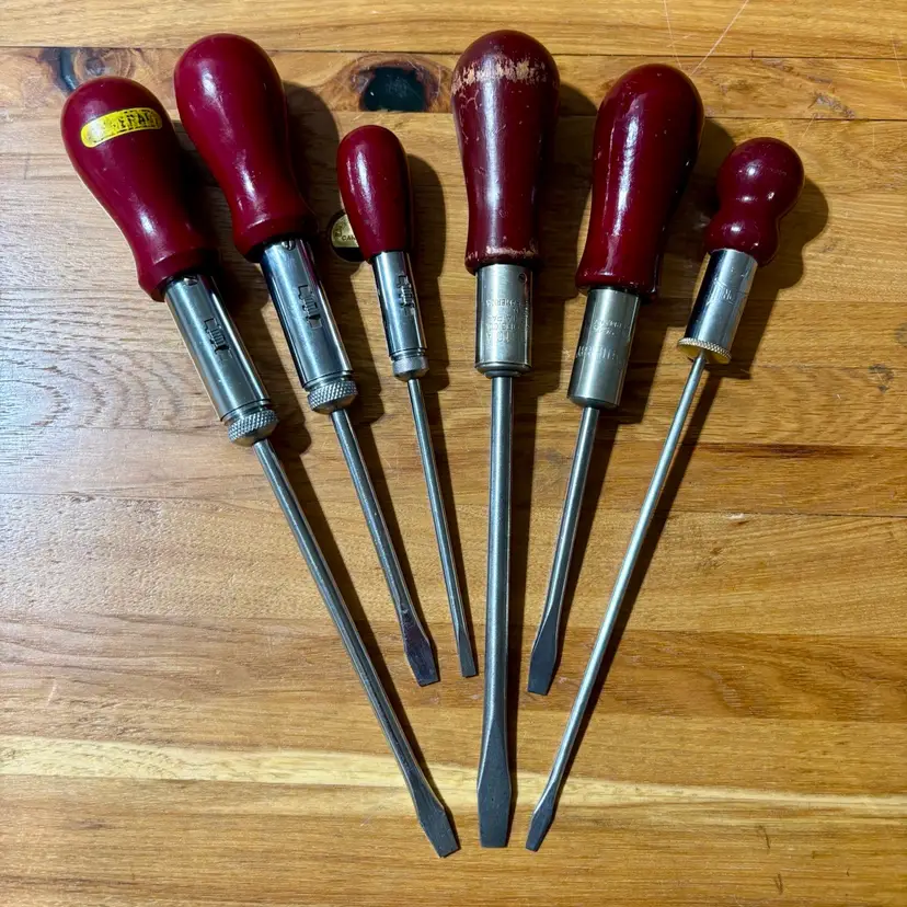 Very Nice collection of ratcheting screwdrivers. 6 total of varying sizes and lengths, all flat head. All screwdrivers work perfectly in both directions as well as locked into place like a traditional screwdriver. Includes North Bros “Yankee” 10A, German Witherby No. 7524, Speedrill No. 3, General No. 1470 with partial decal handle, General No. 1460, and a General No. 1450. See pictures for details. Let me know if you have any questions.
