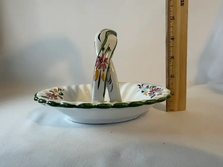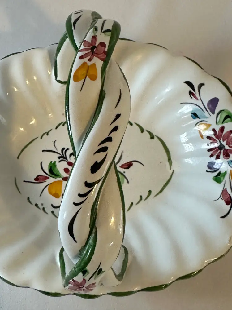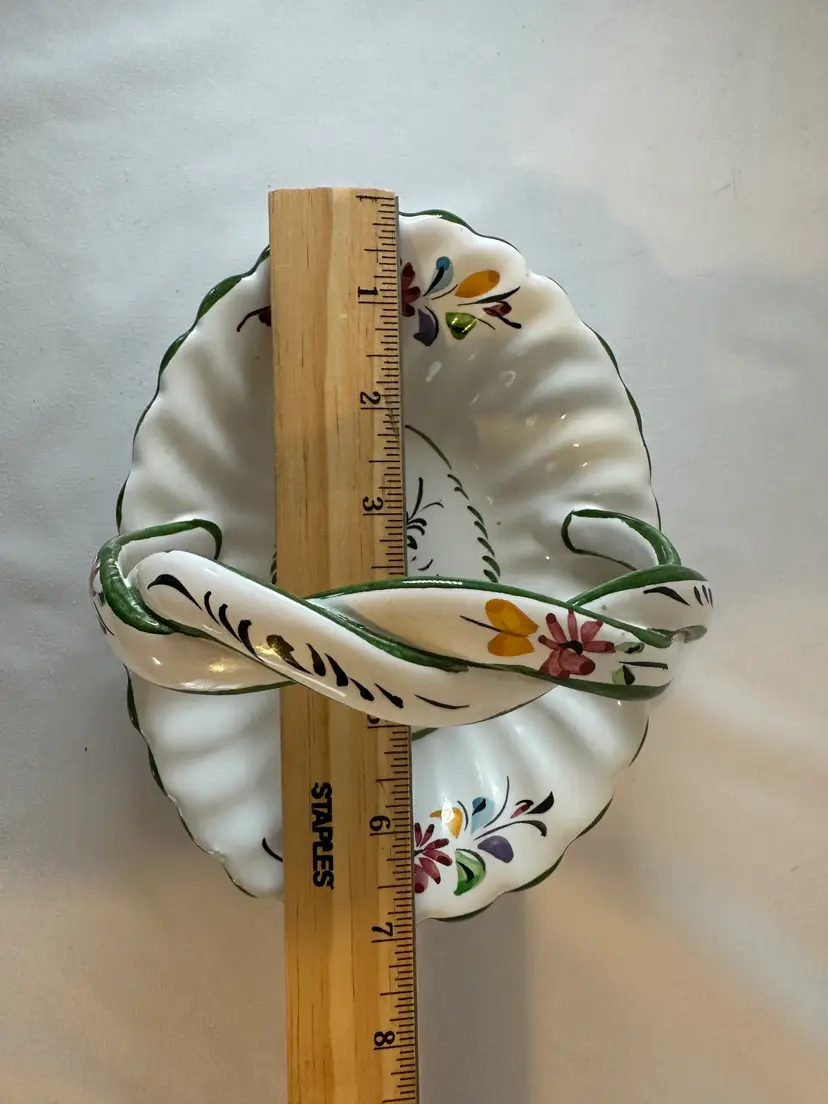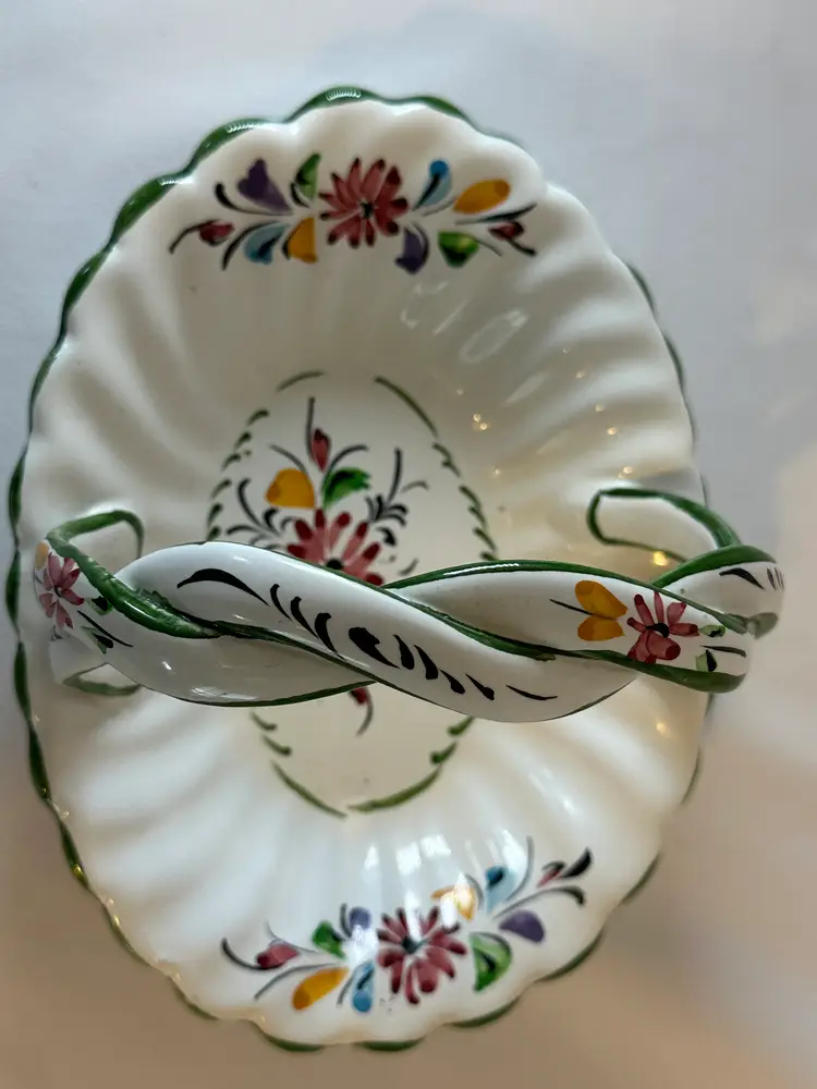 Vintage ceramic basket with hand painted floral design. Made in Portugal. Measures approximately 7” in diameter x 4.5" in height