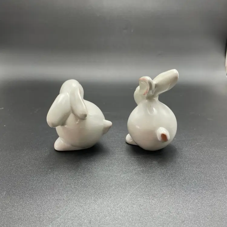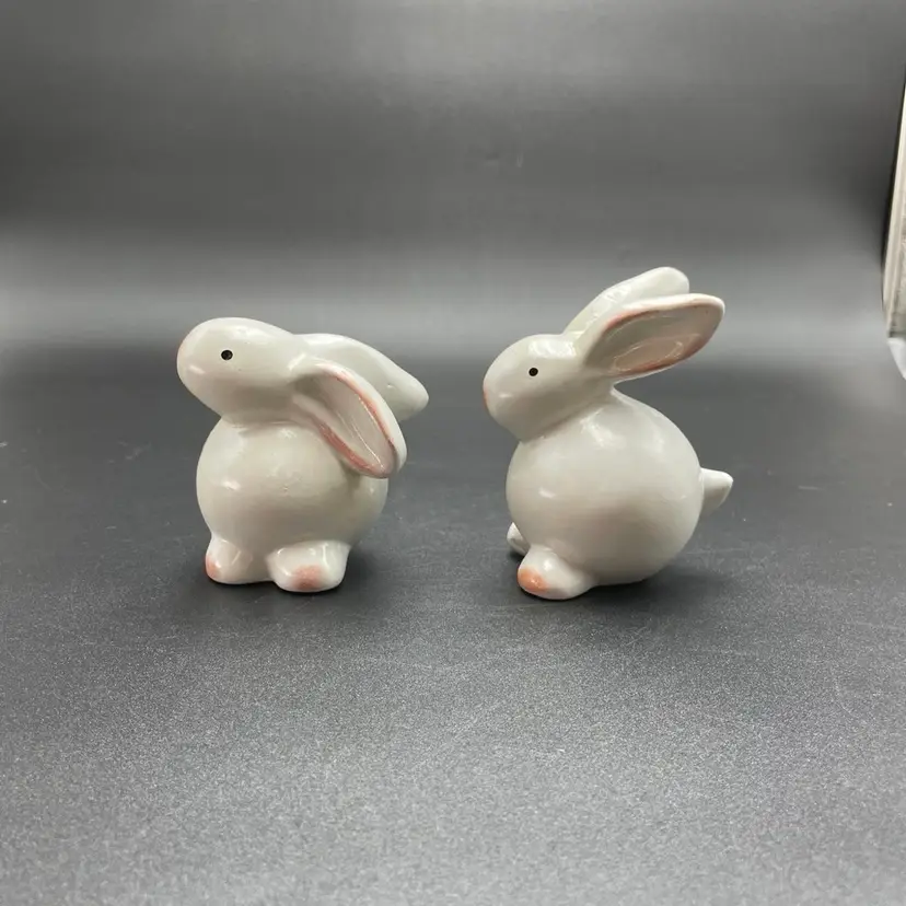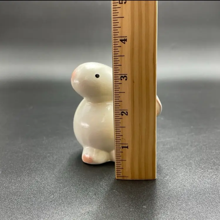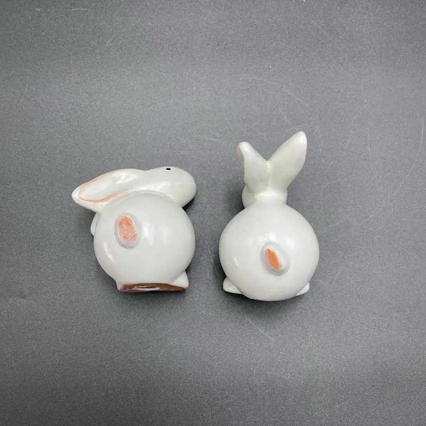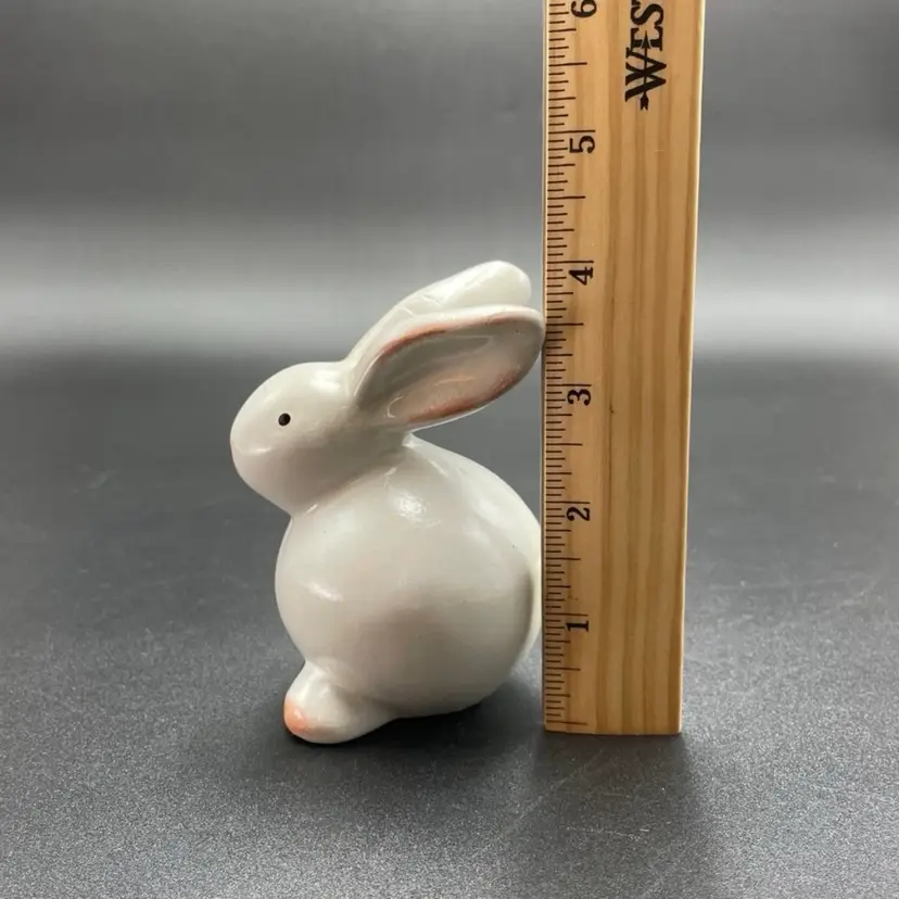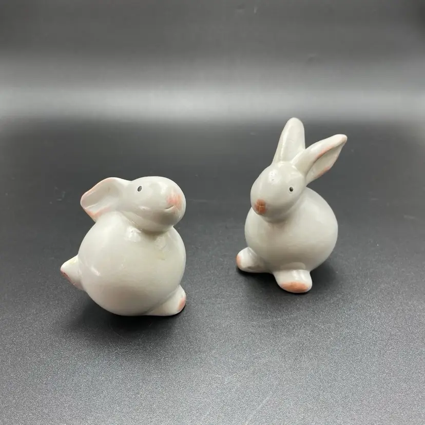 This is a set of 2 white redware pottery rabbit figurines. One measures approximately 3.25" tall. The other measures approximately 4" tall. No chips or cracks.