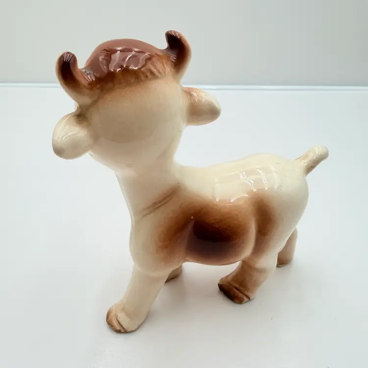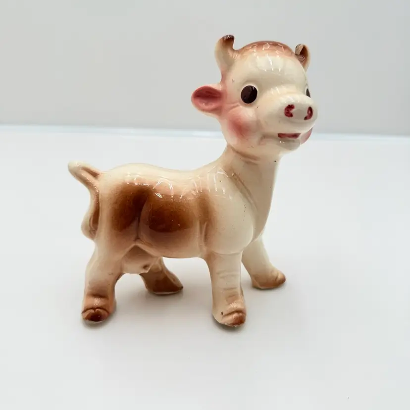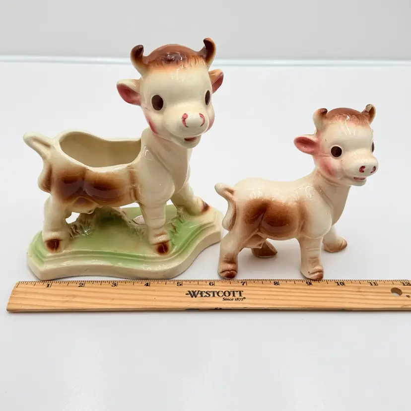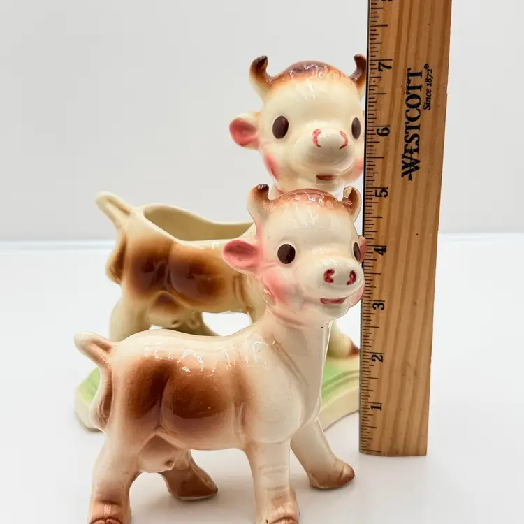 As shown 5-7 inches tall by 4-6 inches long Planter has no chips or cracks. Small cow has small chip on horn