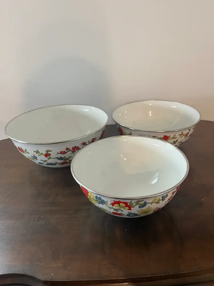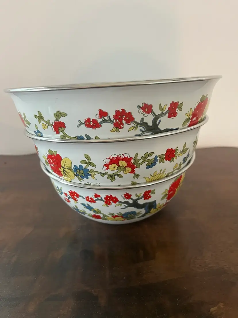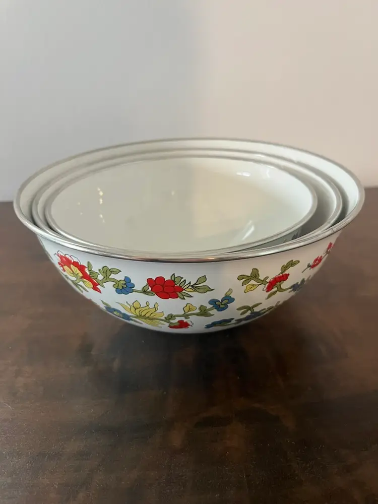Set of 3 1970s enamelware nesting bowls 8 1/2”, 7 1/2” , 7” Great condition