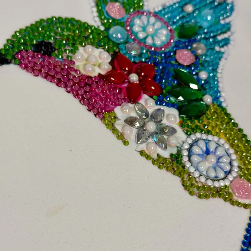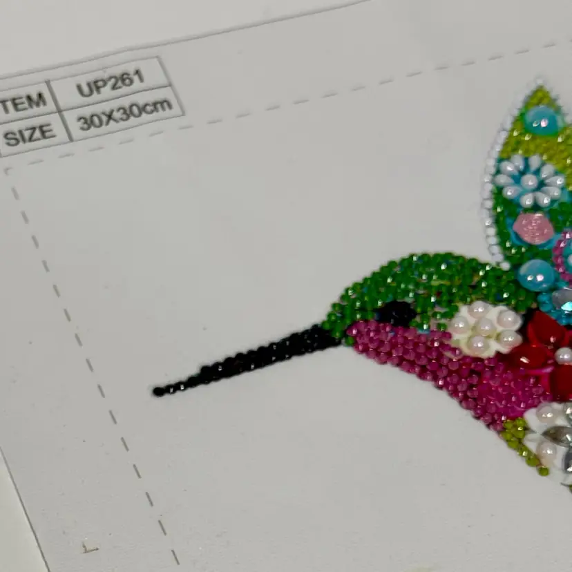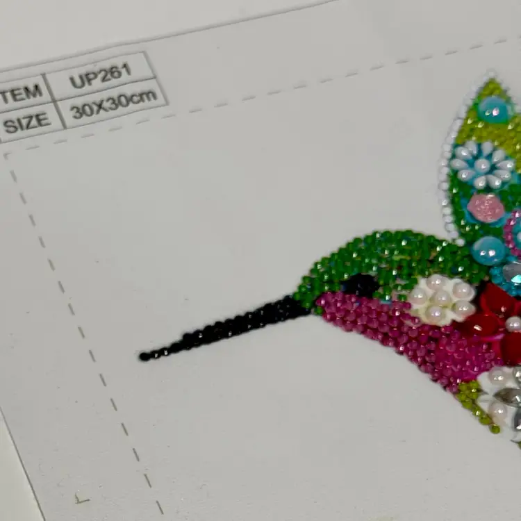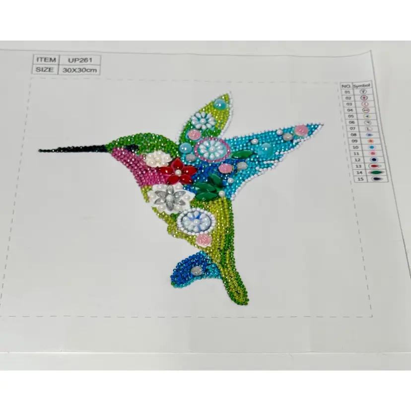 This is a 5D special shaped crystal rhinestone hummingbird diamond painting done from a kit. It is a DIY craft project where you apply rhinestones and special shaped drills to a pre-printed canvas to create a mosaic art Features a colorful hummingbird design with various shaped rhinestones and beads. Size: The canvas dimensions are 30cm x 30cm (approximately 12x12 inches).