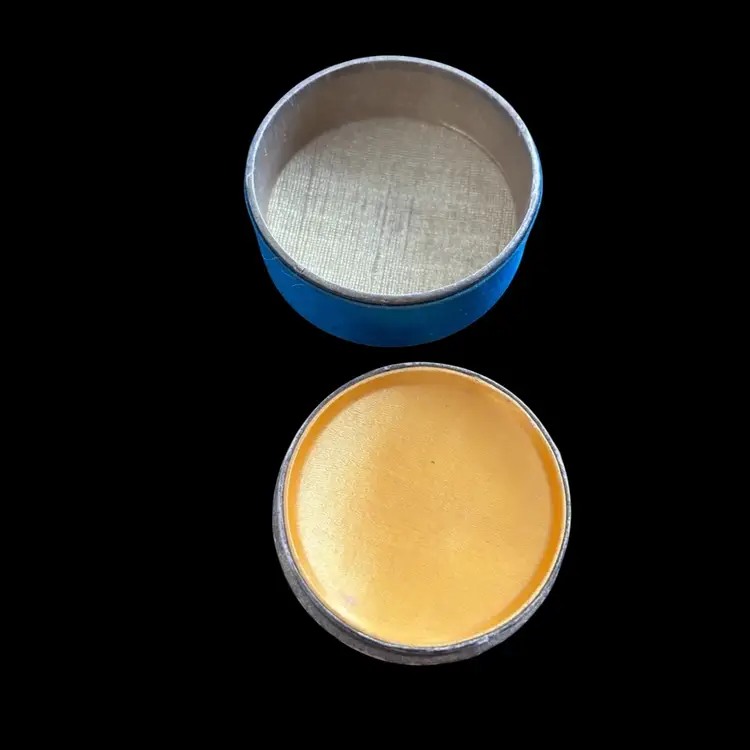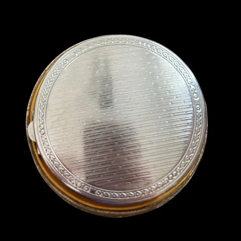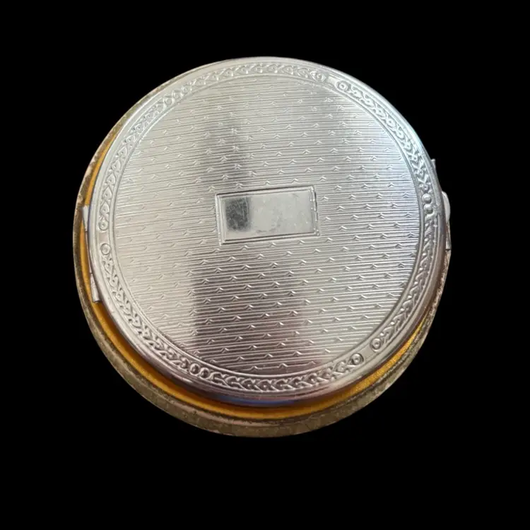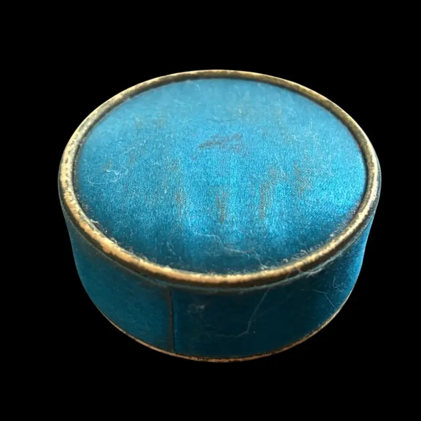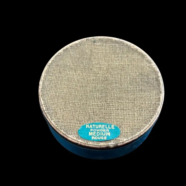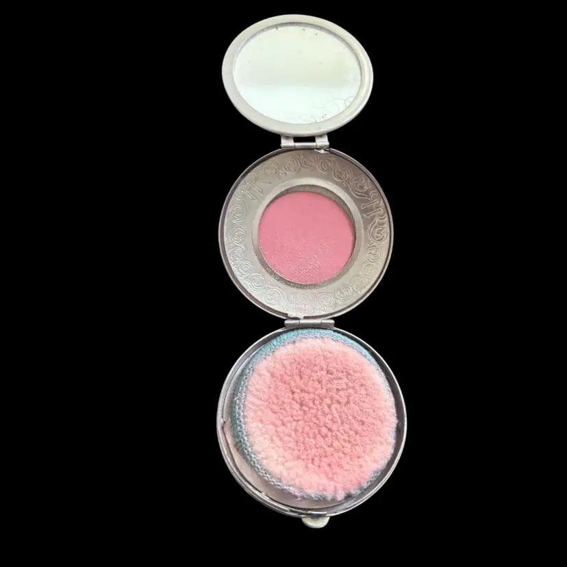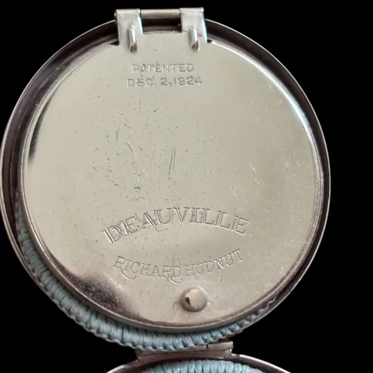 Lovely vintage Robert Hudnet Deauville compact in satin blue case, 1920s. Case in vintage condition with some wear, compact in nice condition. Still contains power, selling as display/decor piece. Case: 2.5x1” Compact: 2”
