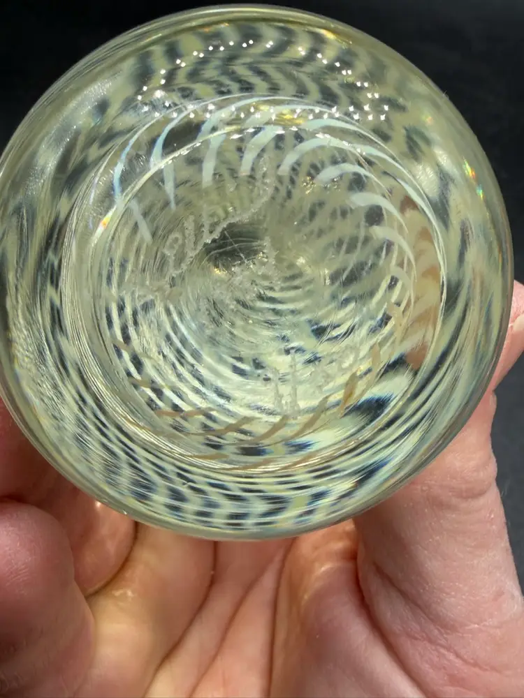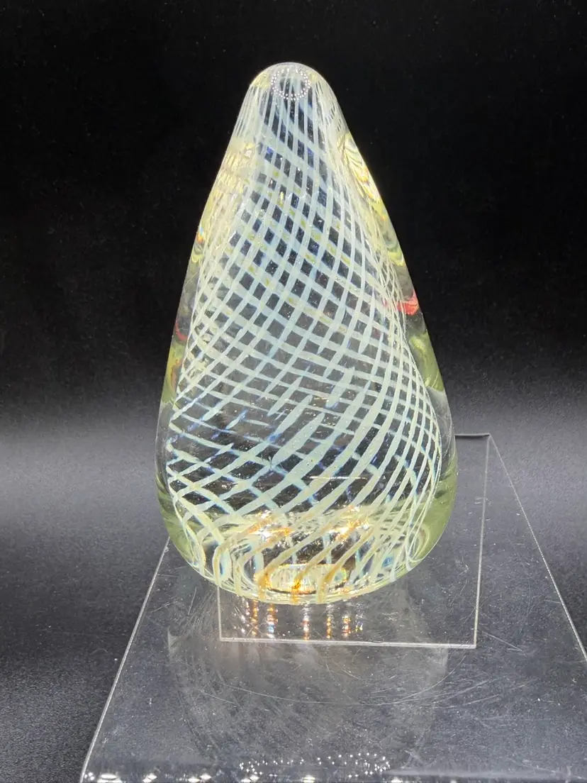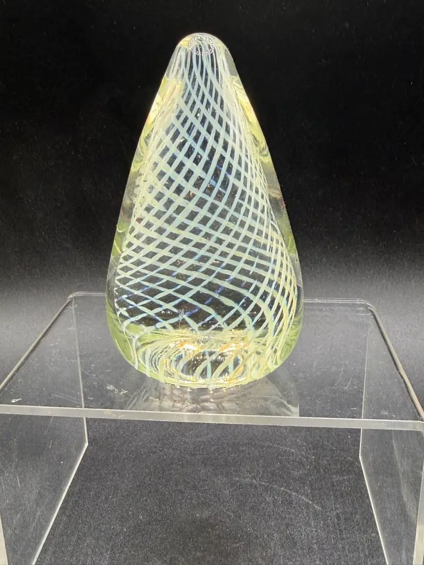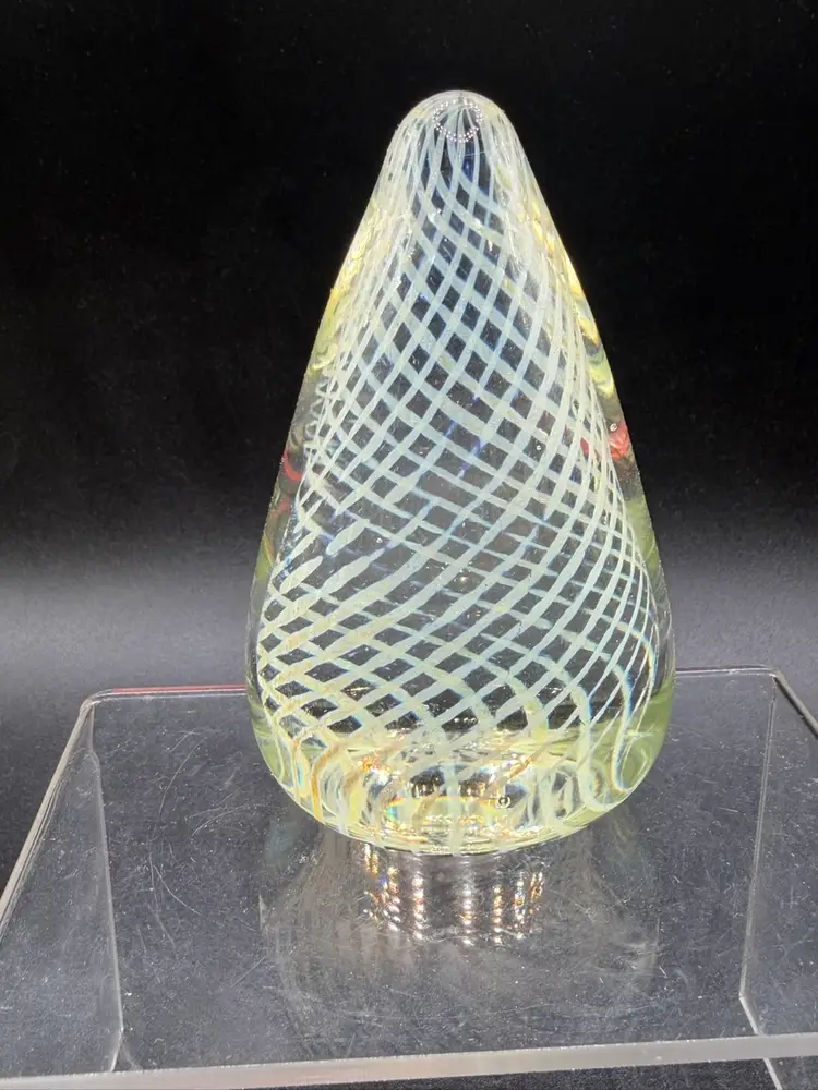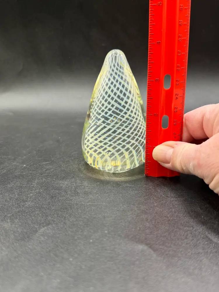 The ROBERT EICKHOLT Limited Edition 9/50 Glass Paperweight is a vintage piece featuring a swirl ribbon pattern, hand-blown from clear art glass. This unique paperweight is a one-of-a-kind collectible from the late 20th century, showcasing a detailed and intricate design. Made in the United States, this limited edition piece bears the signature of Robert Eickholt, adding to its value and charm for collectors of art glass paperweights.