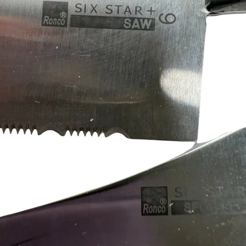 RONCO SIX STAR+ KNIVES - SET OF 3: (SHOWTIME # 1, SAW #6, SPORTSMAN # 8) PREOWNED NEVER USED, IN ORIGINAL SLEEVES/WRAPPER. (please See Photos).