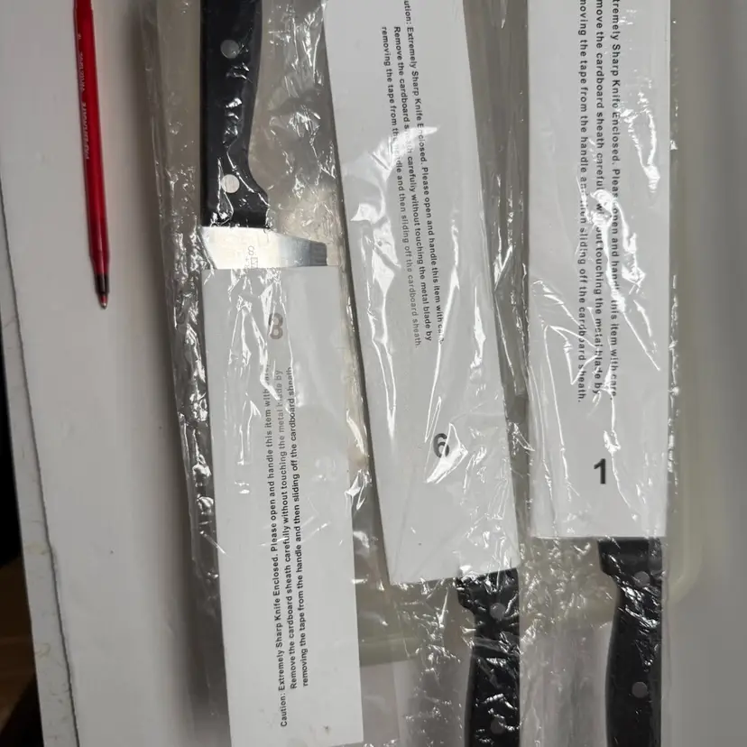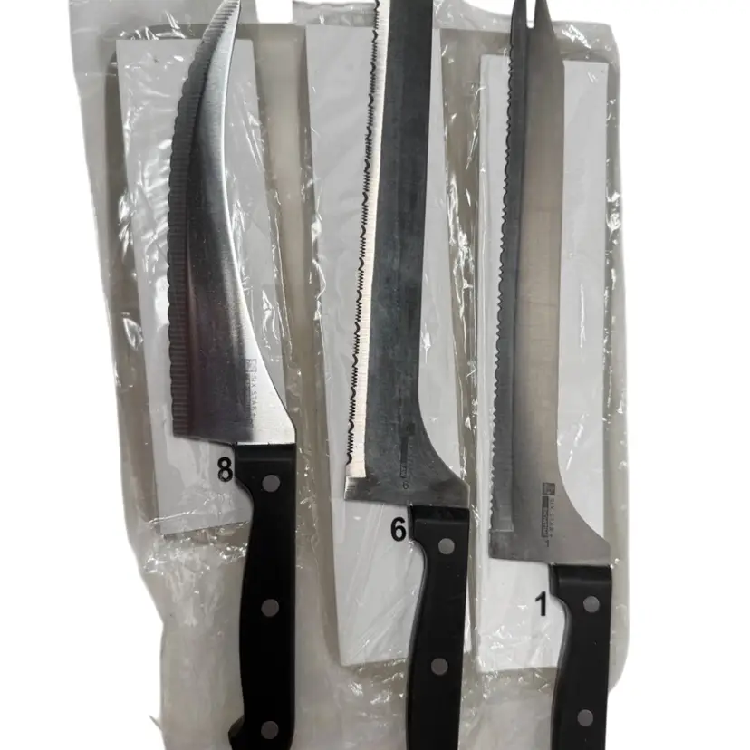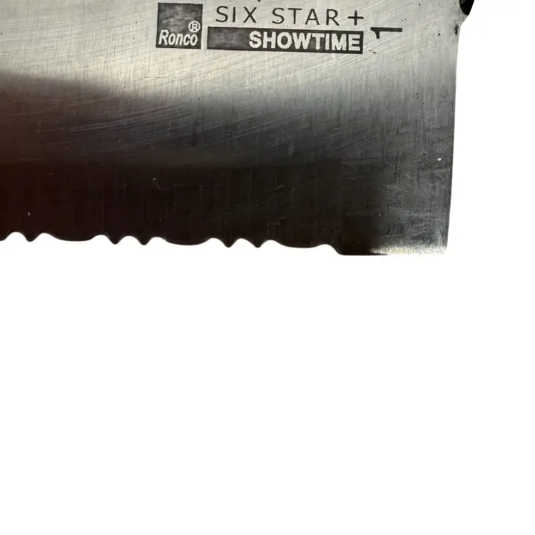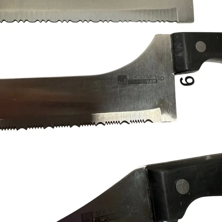 Set of 3 Ronco Six Star+ Kitchen knives- Showtime #1, 14 1/4” long; Saw #6, 14 1/4” long; Sportsman #8, 11 3/4” long; PREOWNED Never Used, in original wrapper:sleeve new condition. (Please see photos).