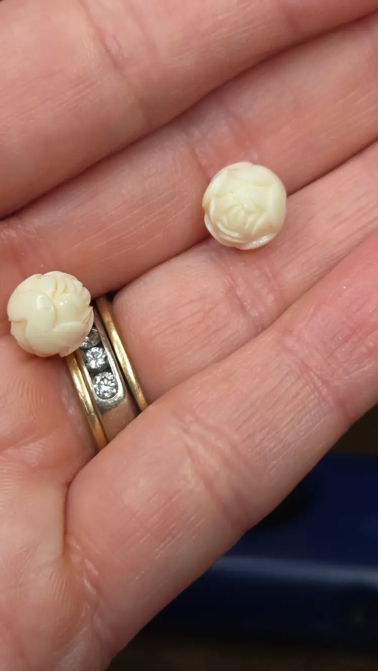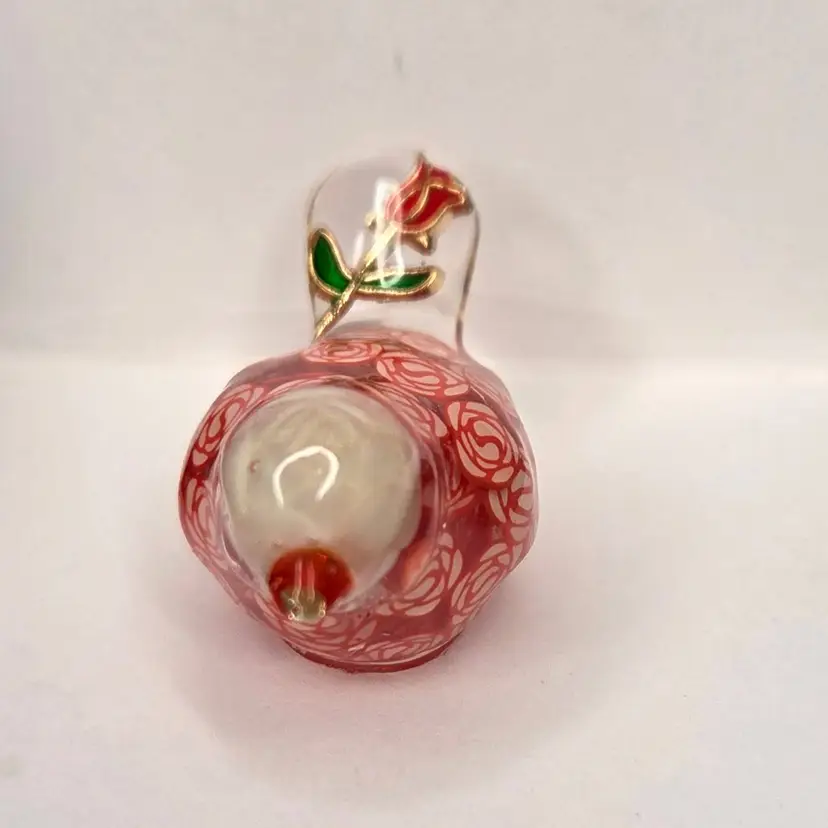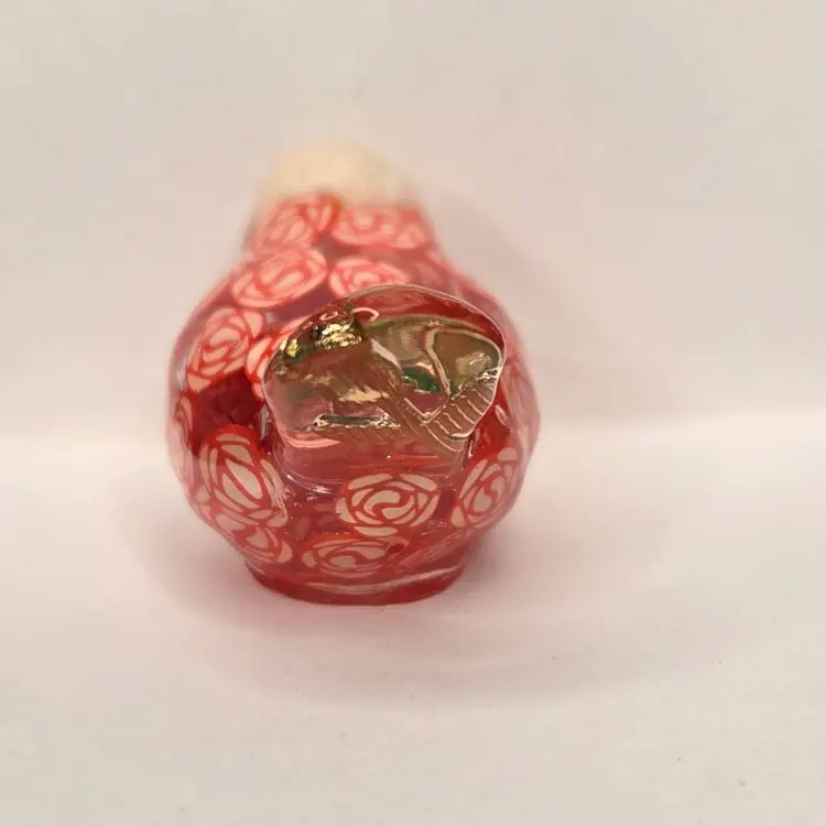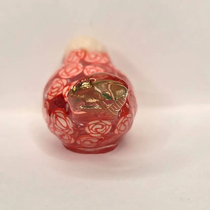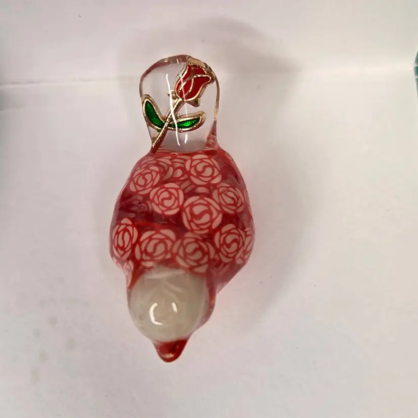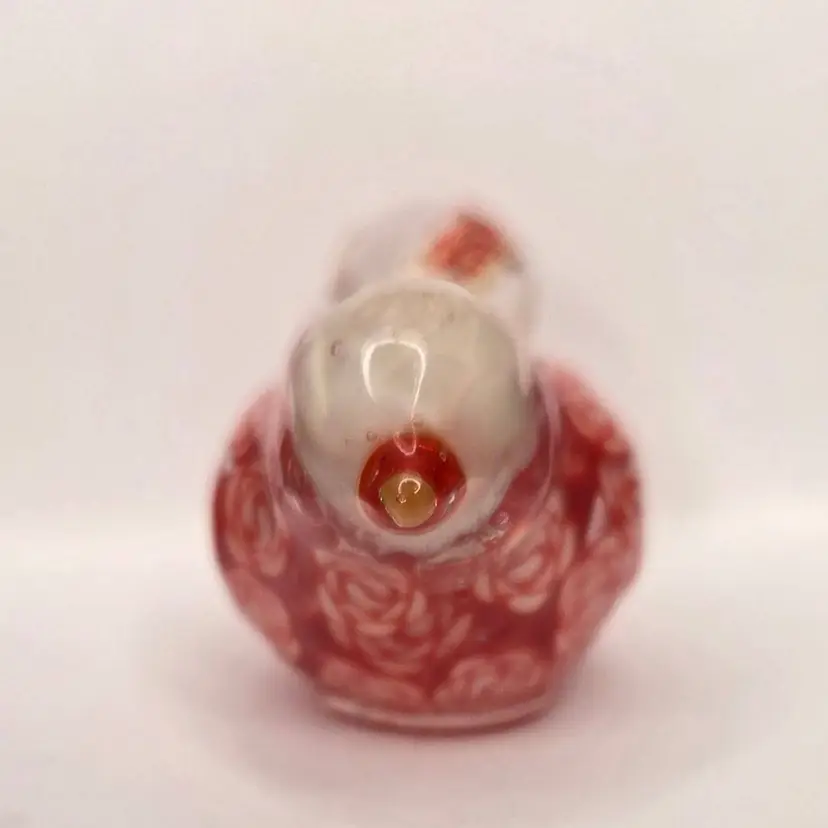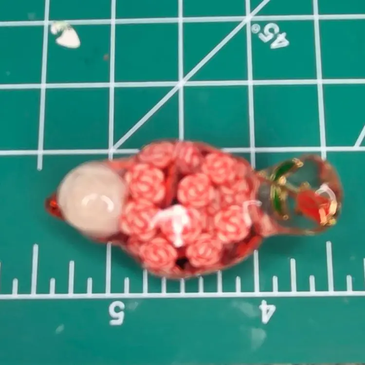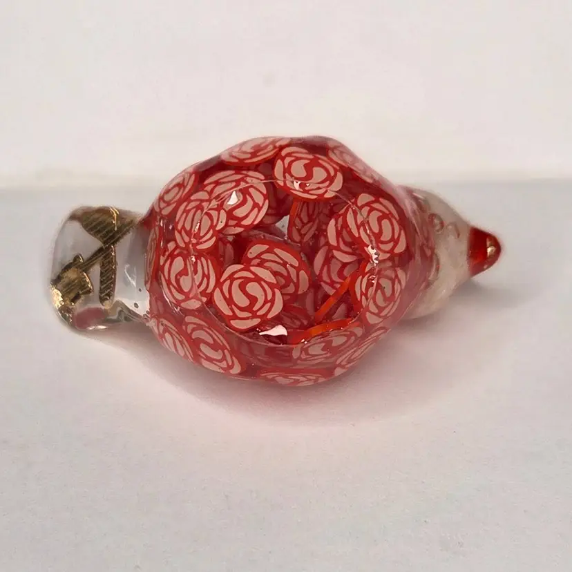 This gal is made with a red seed bead beak, a white rose bead harvested from a bracelet, her tail is a rose charm and her body is filled with polymer clay rose slices.