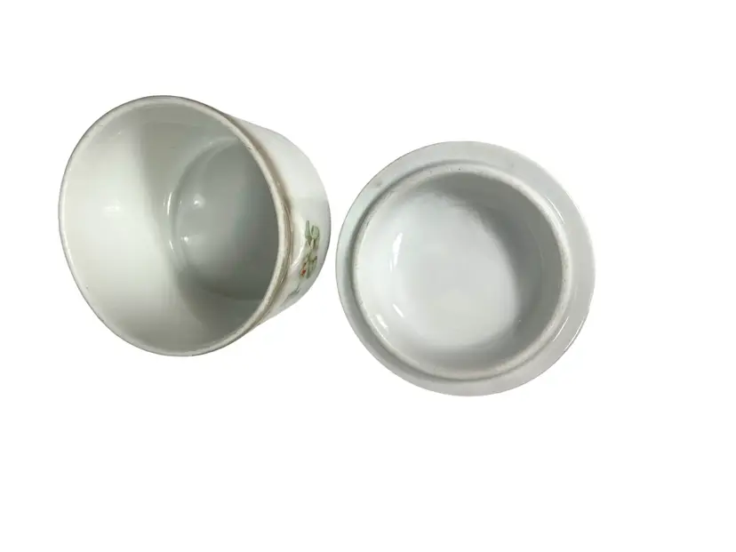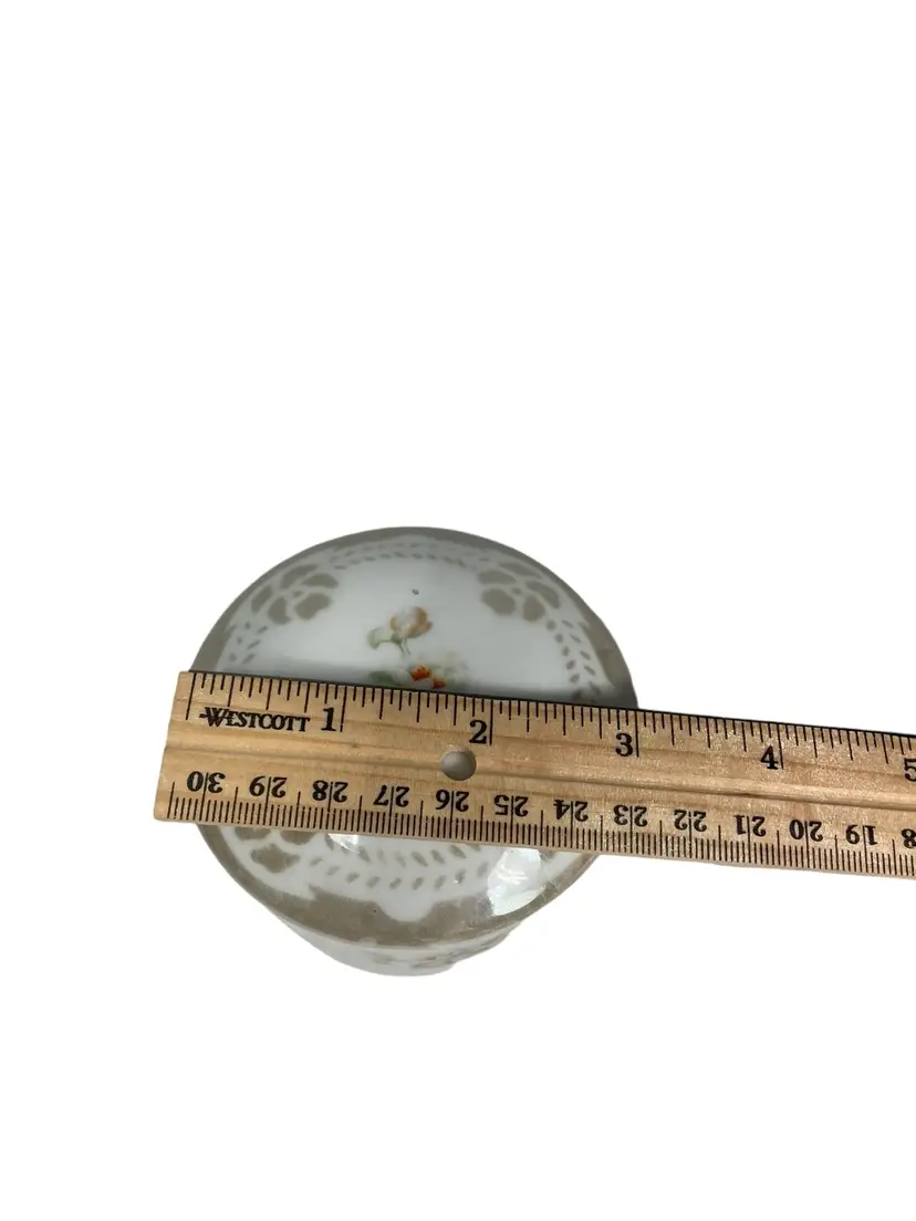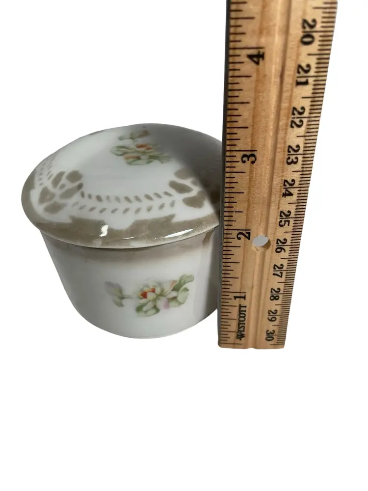 Porcelain. Height with lid 2.75”, diameter 4.25”, depth 1.75”. Light wear on the luster paint. No chips or cracks.