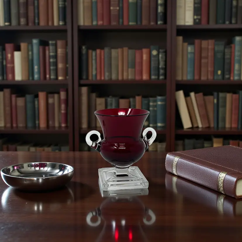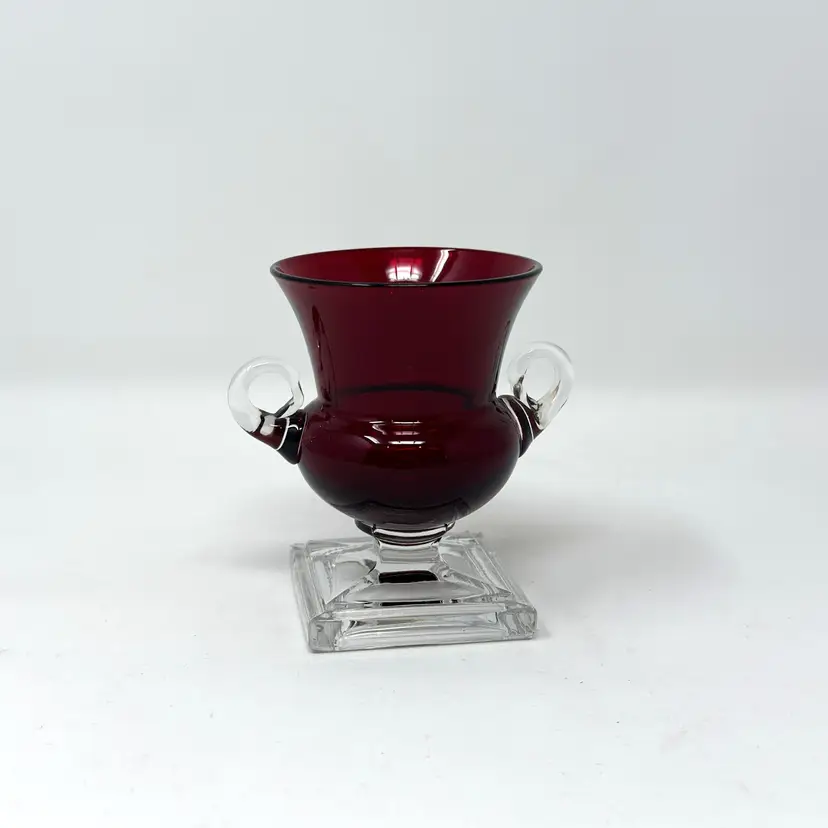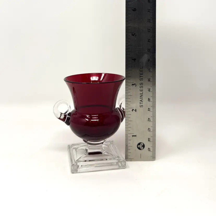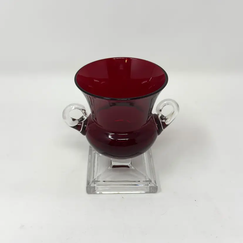 This vintage ruby red Grecian urn vase by Duncan & Miller features clear applied handles and a molded pedestal base, standing just 3.5 inches tall. Made of richly colored glass with a deep cranberry tone, it reflects the refined craftsmanship Duncan & Miller was known for in the 1940s–1950s. Its compact form was originally used as a cigarette urn, but today it serves beautifully as a small vase, shelf accent, match stick holder, or holiday décor piece.