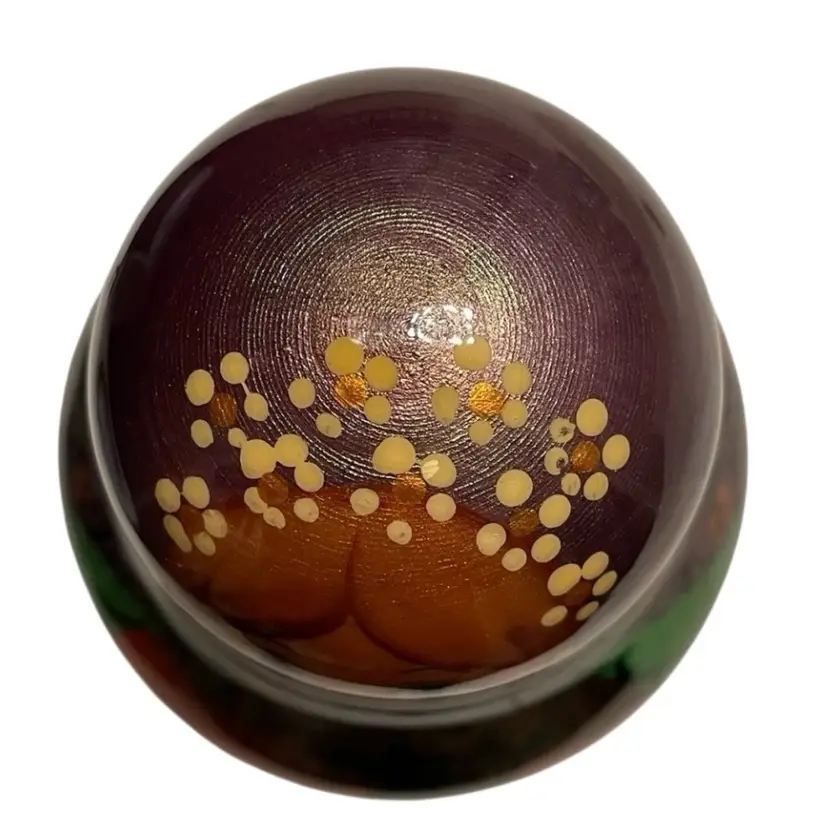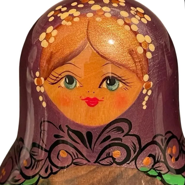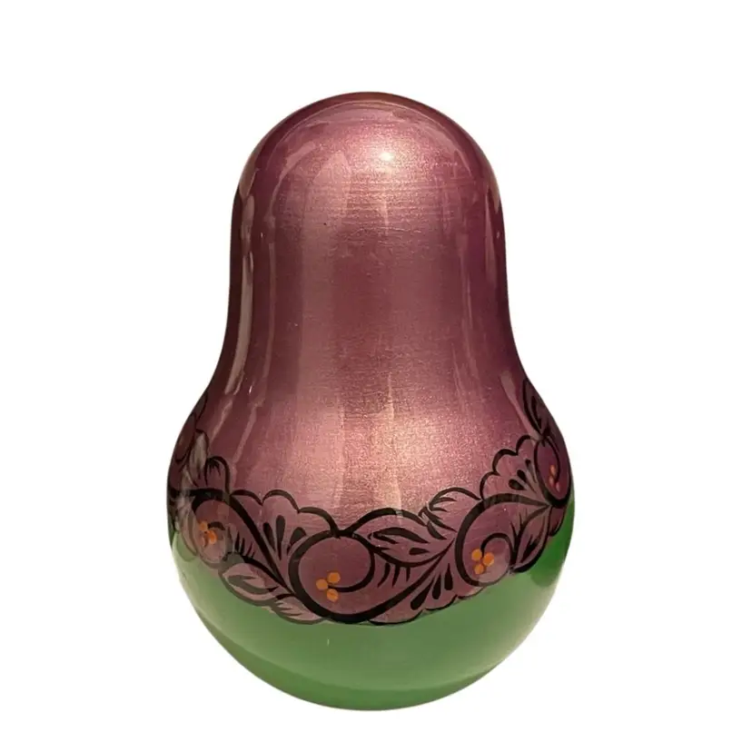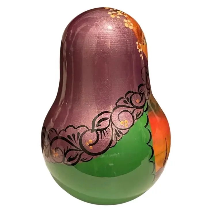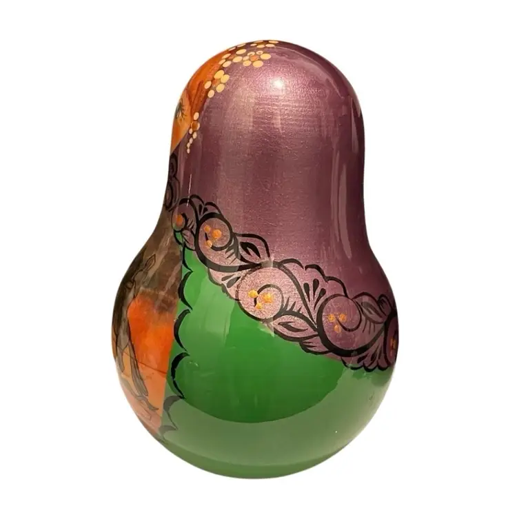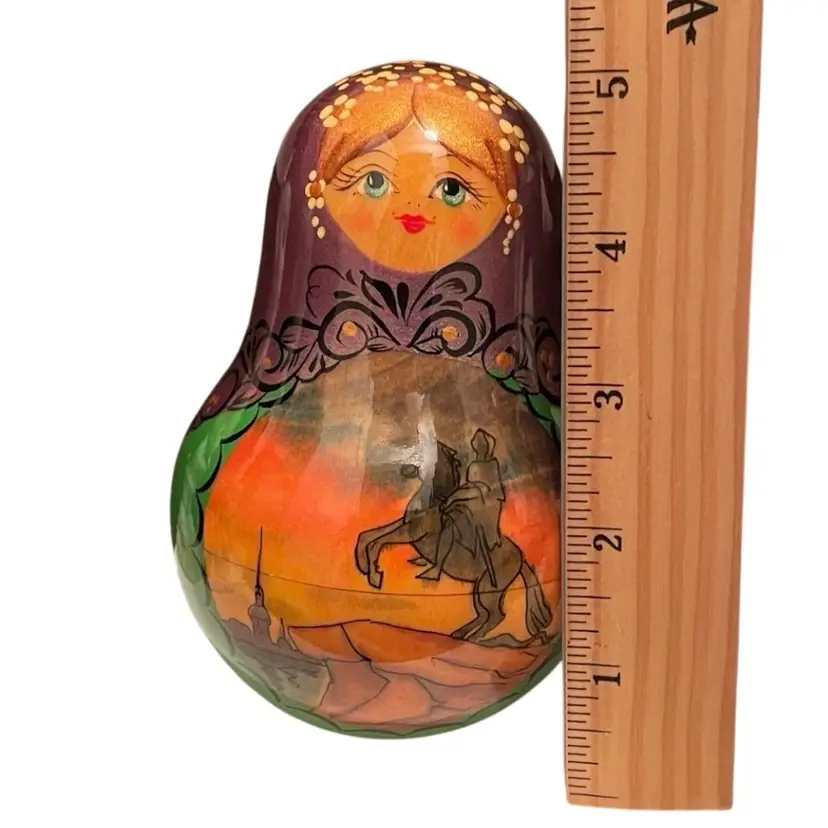 This is a Russian Matryoshka musical chime roly poly doll with a knight (Druzhina) and horse scene. Measures approximately 5" tall. No chips or cracks.