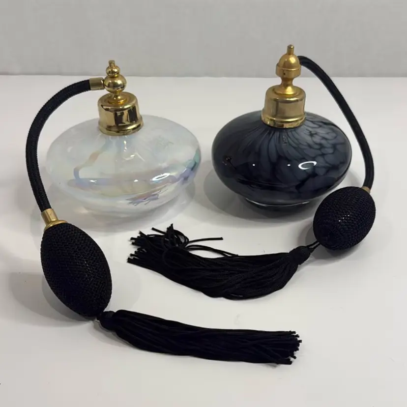 Set of 2, one is iridescent white, one is smoky grey. Excellent condition. 4” wide, 4” tall.