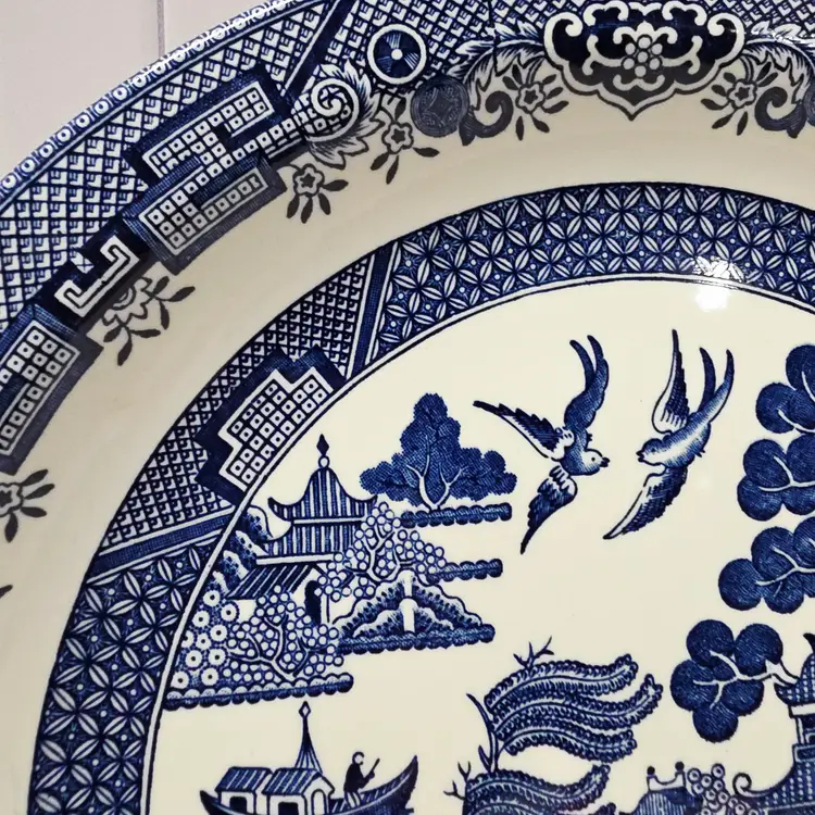 This set includes two 12" round chop plates in Churchill’s Willow Blue pattern, featuring the iconic blue-and-white chinoiserie scene with pagodas, bridges, and birds in flight, all rendered in rich cobalt on a creamy white glaze. The Georgian shape offers a wide rim and classic silhouette, making these platters ideal for serving roasts, baked goods, or displaying vintage charm on a hutch or wall. Churchill is a respected Staffordshire pottery known for producing durable earthenware and faithful reproductions of historic transferware designs. The Willow Blue collection continues a centuries-old tradition, offering coordinated pieces that blend romantic storytelling with practical elegance.