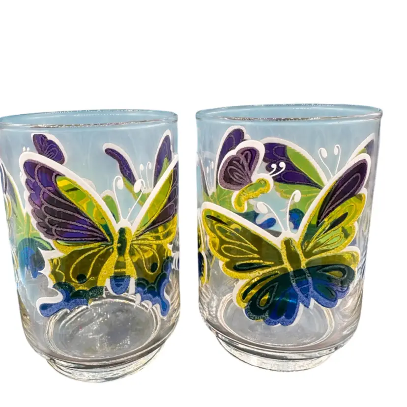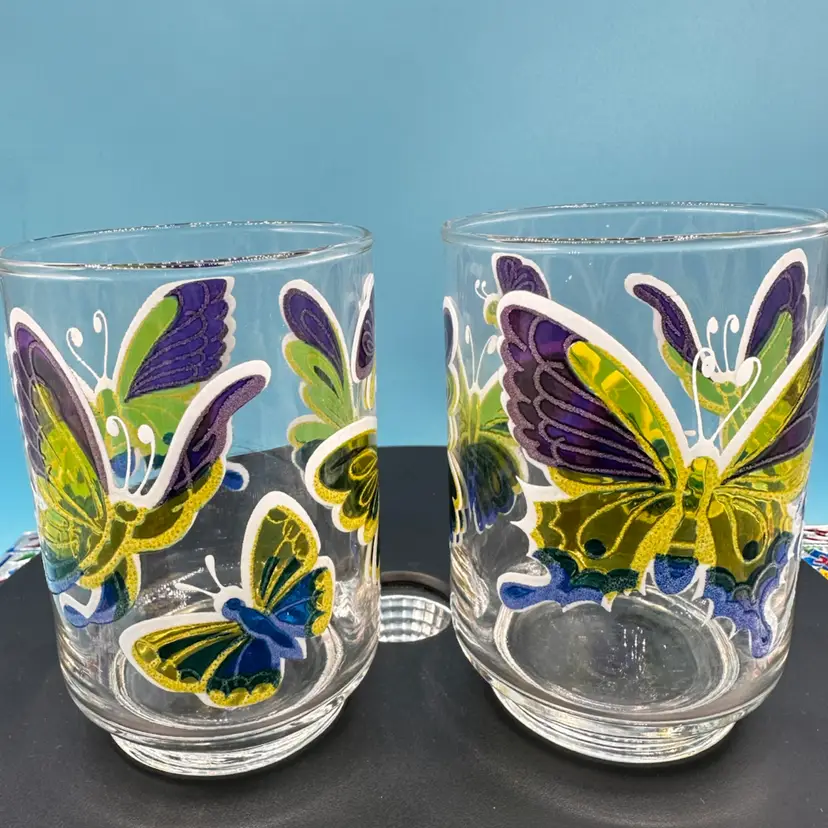 Each glass measures approx. 4" tall x 2.5" wide. Each holds approx. 10 fl oz. Good condition.
