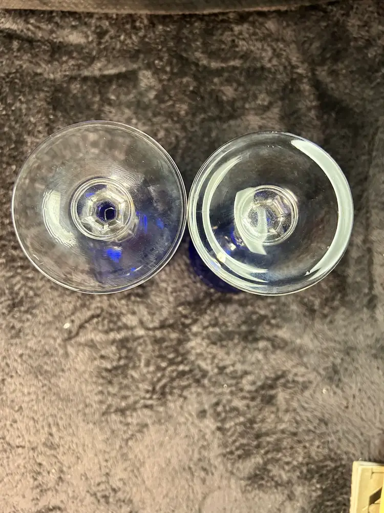 They feature a cobalt blue bowl with a cut-glass design atop a clear, faceted stem and base.