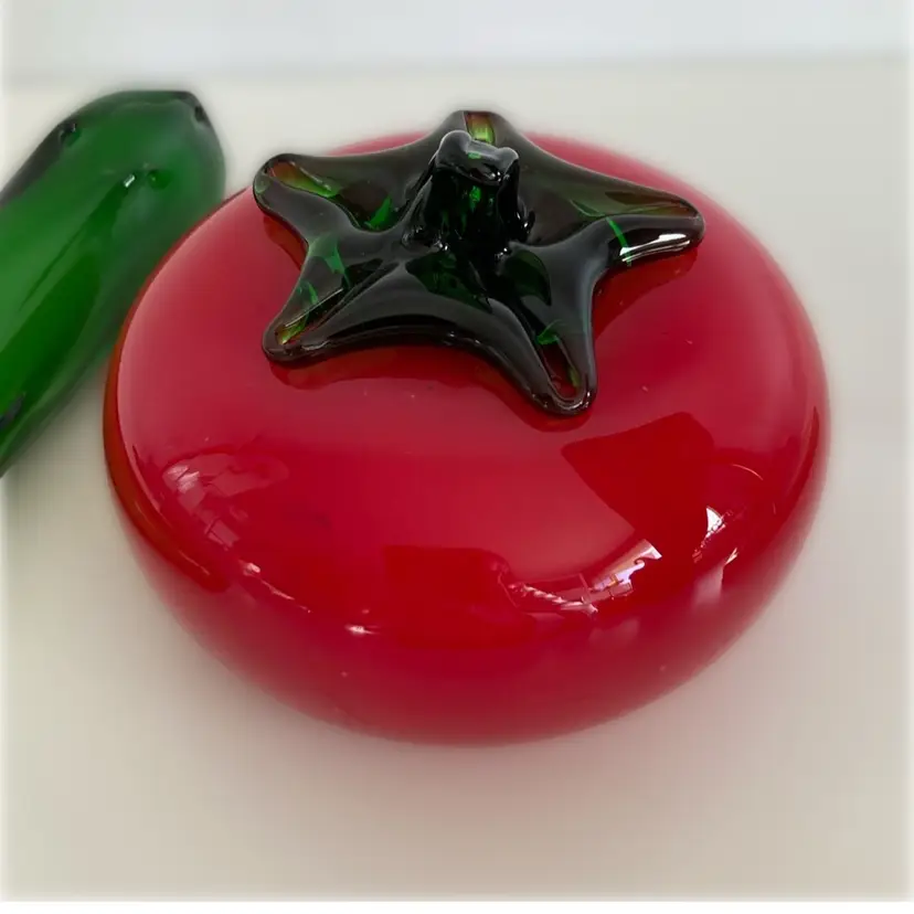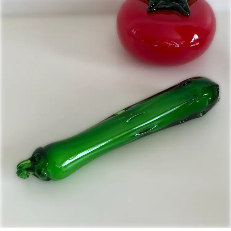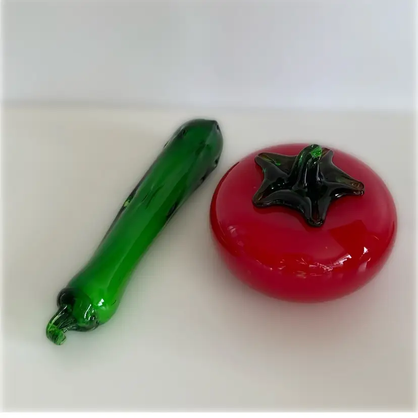 Set of 2 vintage handblown glass vegetables. The tomato measures 3 3/4” across x 2 3/4” tall. The cucumber measures 1 1/4” x 6 1/4@ x 1 1/3” tall.
