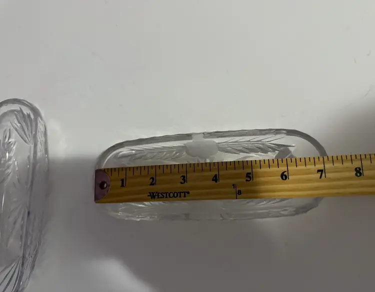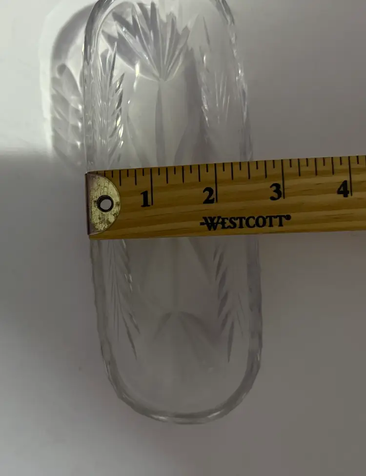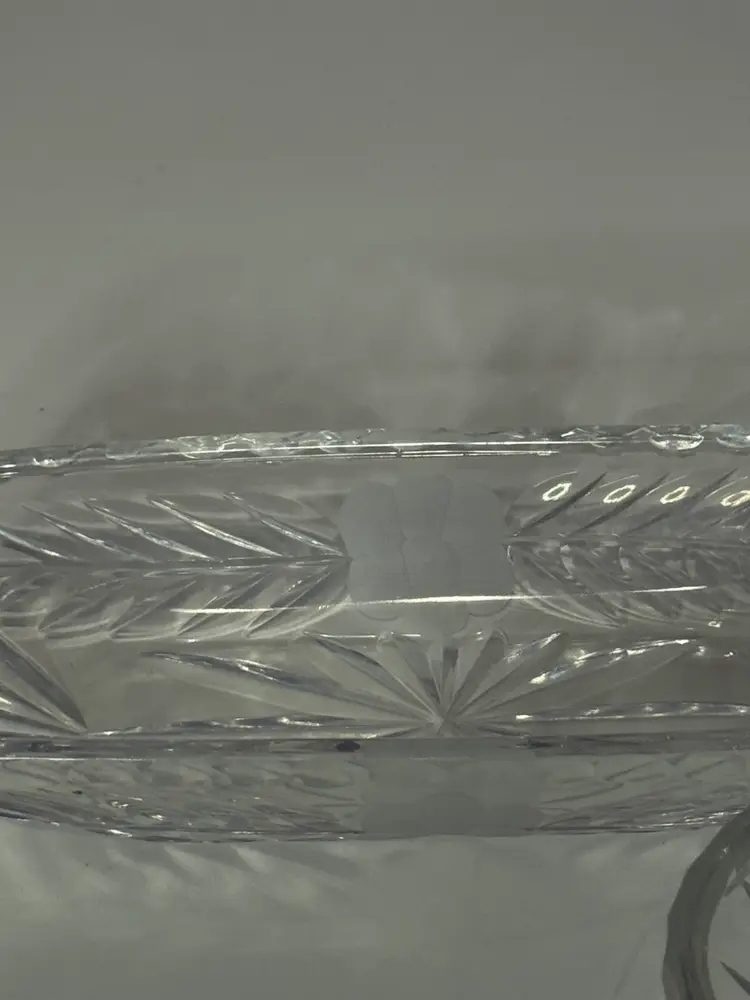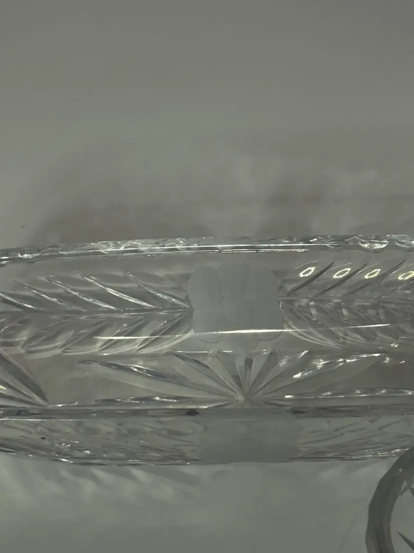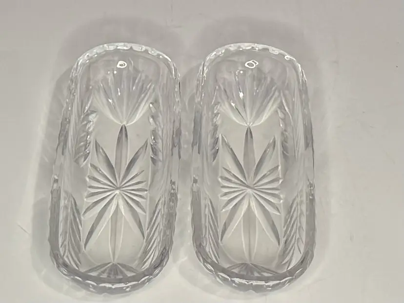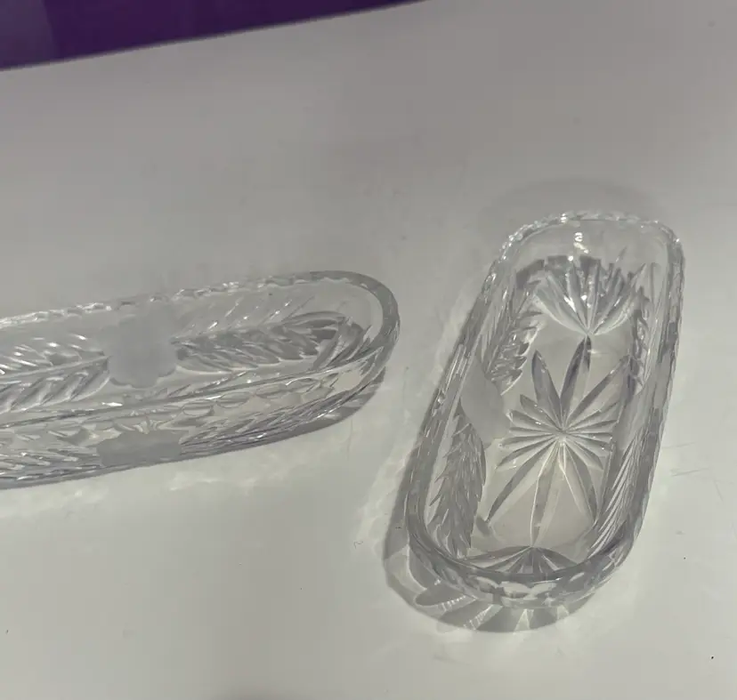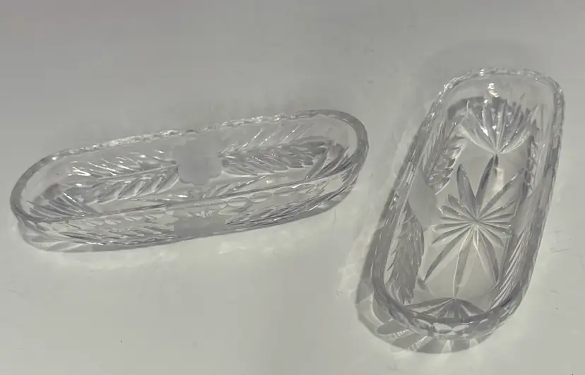 Sparkling vintage glass serving trays for pickles, olives, or nuts. They feature a classic pressed star-and-fan pattern perfect for holiday entertaining.