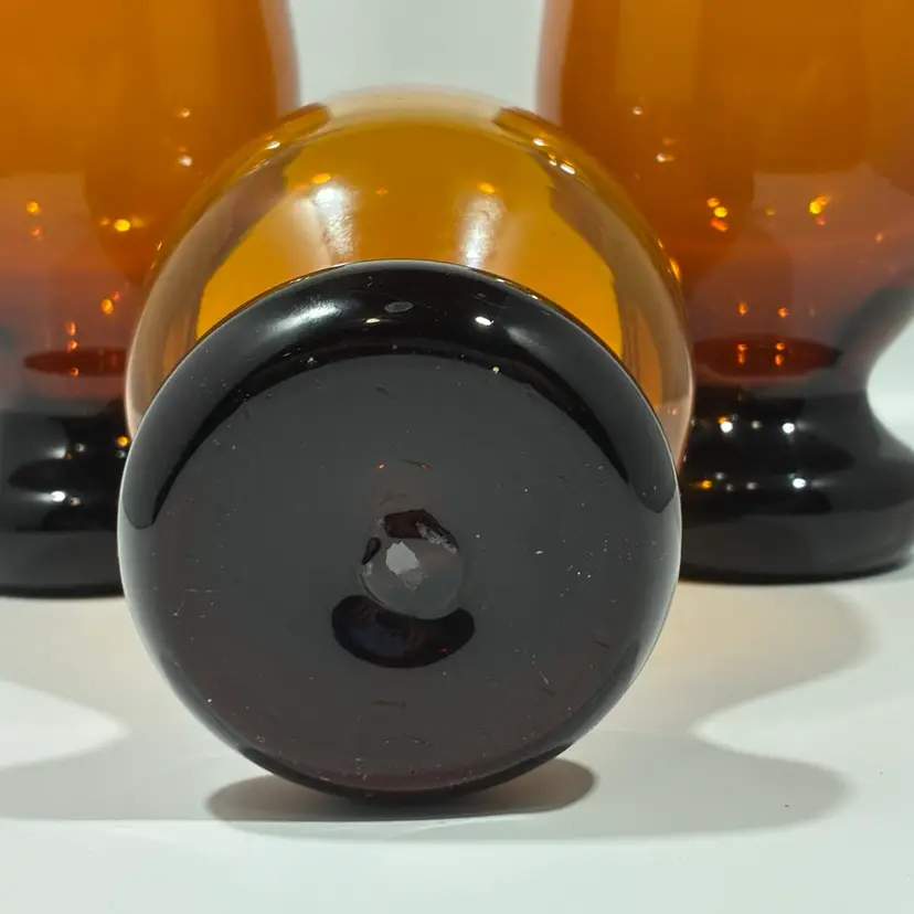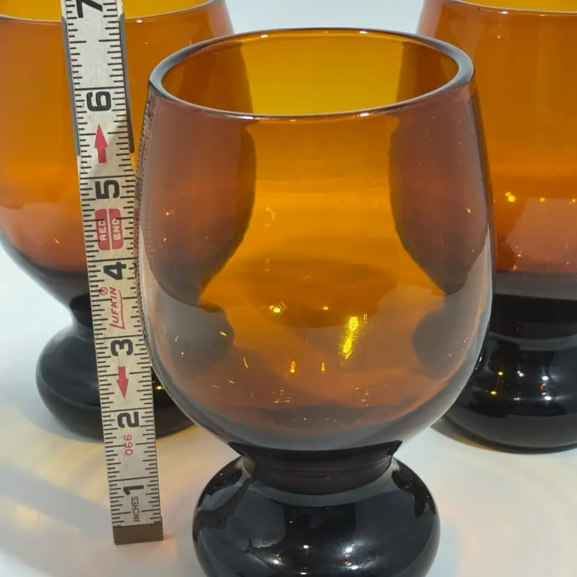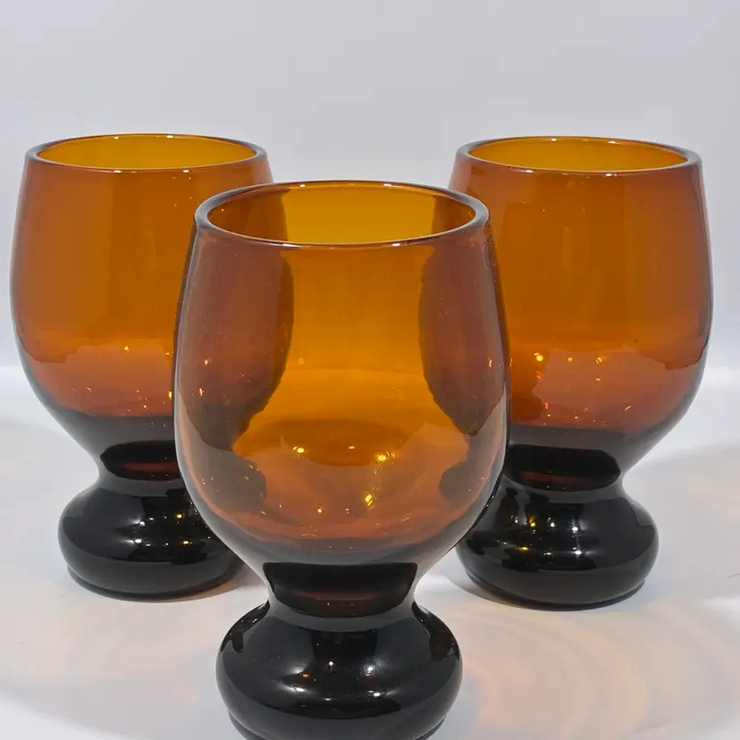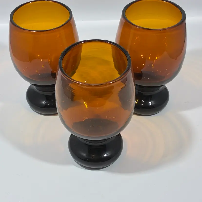 These are a set of vintage amber glass pedestal rummers or goblets, consistent with a mid-20th century, Mid-Century Modern design aesthetic. Design: The glasses feature a round, goblet-style bowl with a distinct black or dark brown, heavy, circular footed base. Material and Color: They are made of amber-colored glass, sometimes described as brown or nutmeg. Era: They are typically dated to the 1950s or 1960s