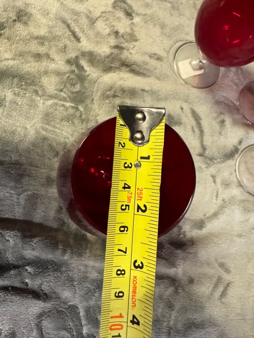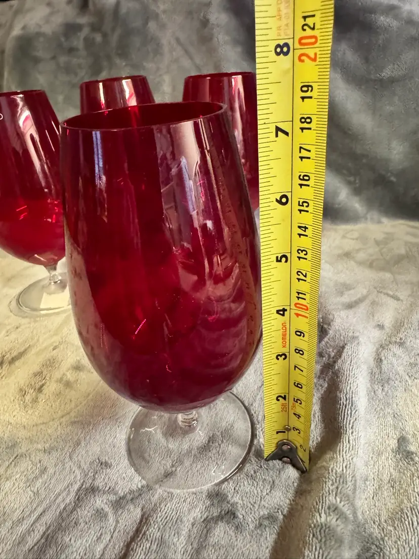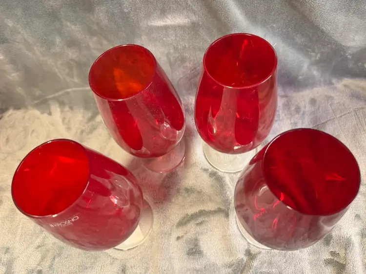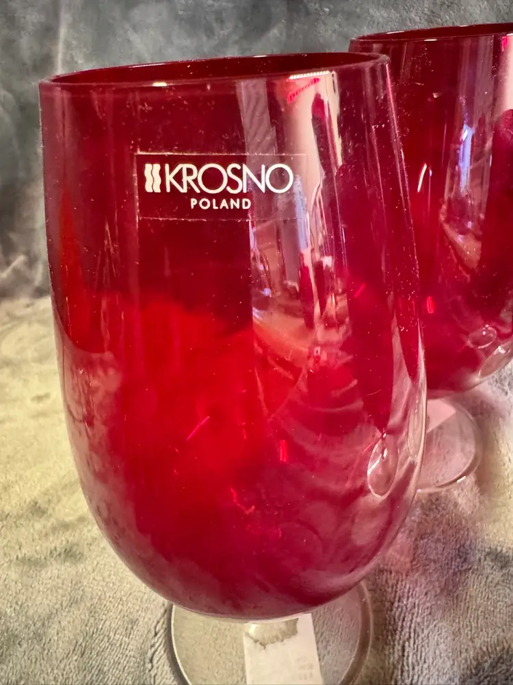 This set of 4 Krosno Poland ruby red stemmed iced tea wine glasses from Crate & Barrel is a contemporary and decorative addition to any table setting. Made of hand-blown glass with a round shape and a 2.5" diameter, these wine glasses are perfect for all occasions. Standing at 7.25" tall, they exude a modern style with a festive red color that will impress guests and add a touch of elegance to your dining experience. Excellent condition. Appear to have never been used. No chips, cracks, or scratches.