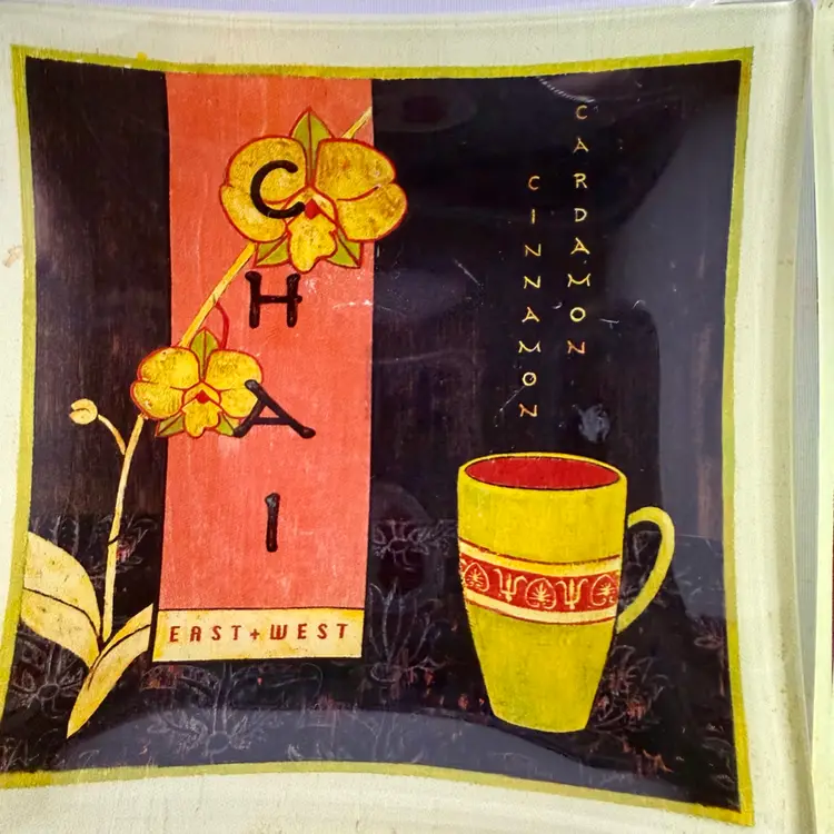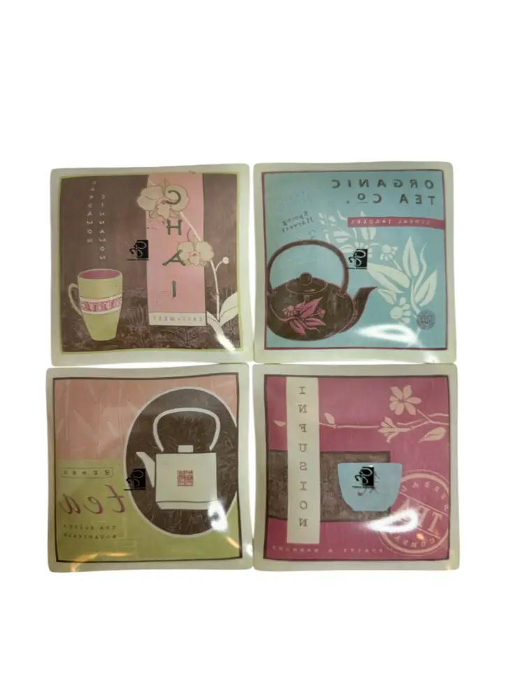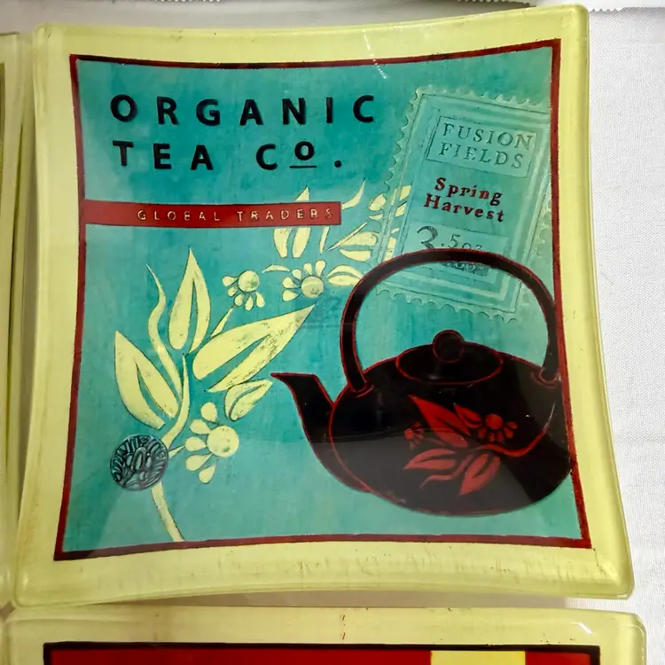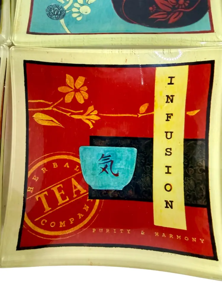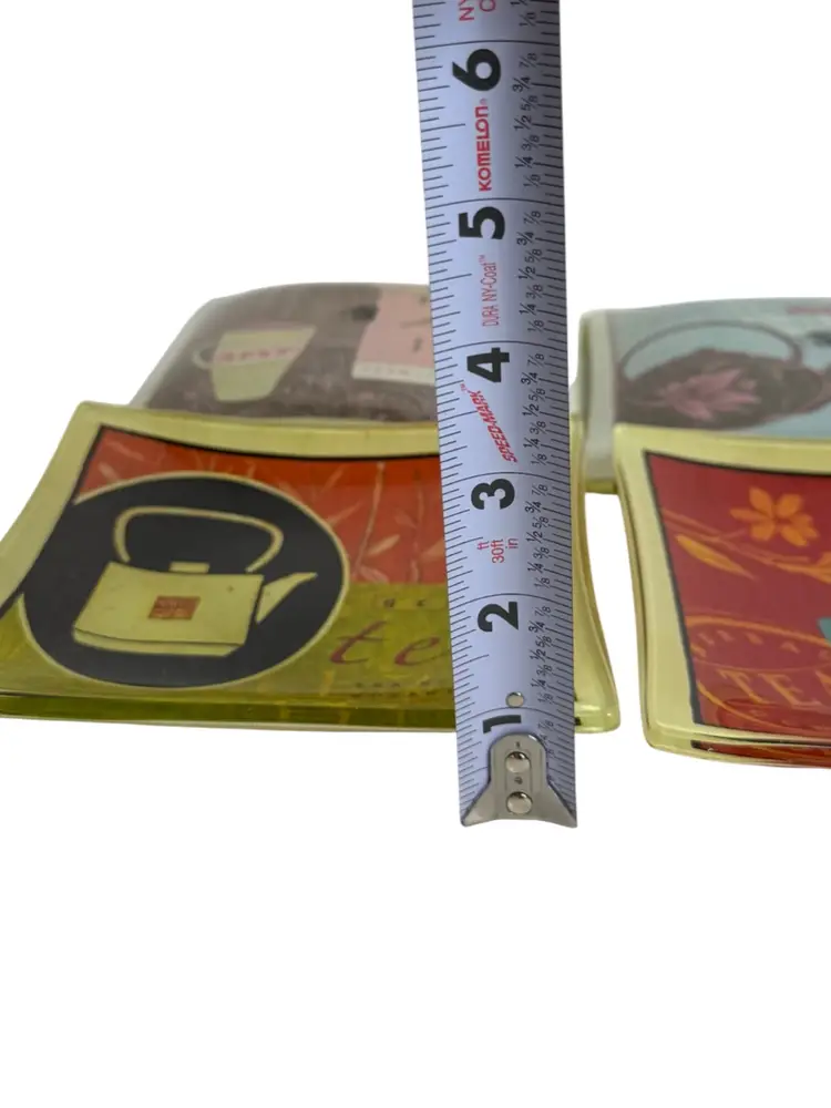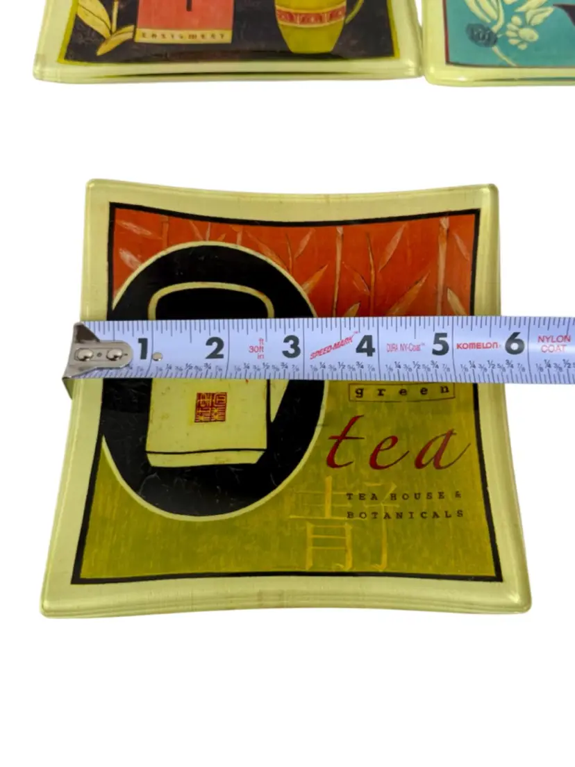 Set Of 4 Prima Donna Square Glass Tea Dessert Plates with labels.