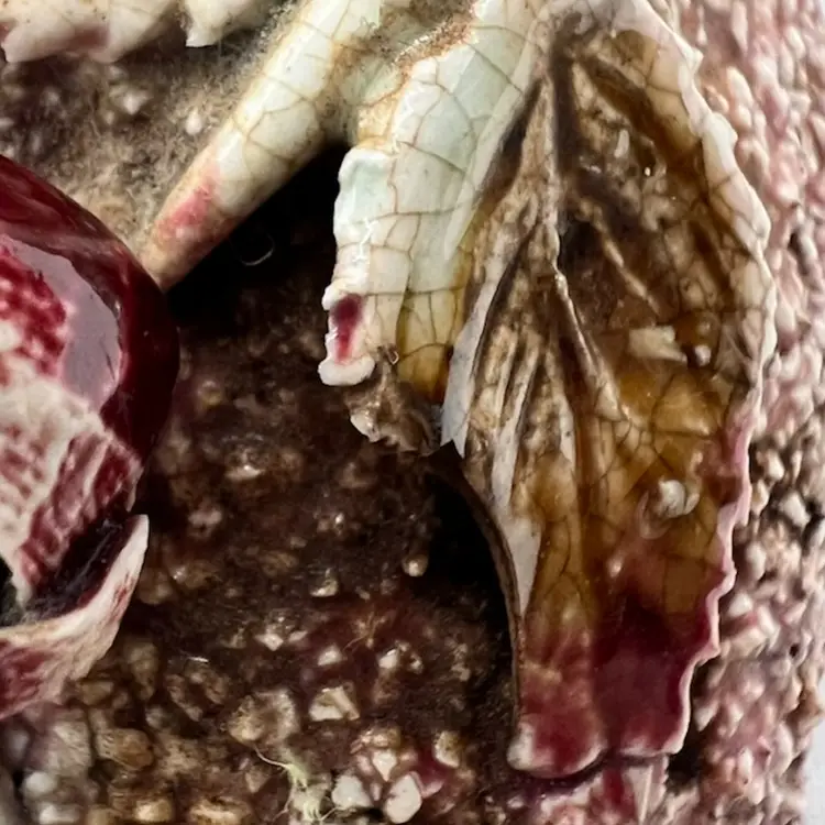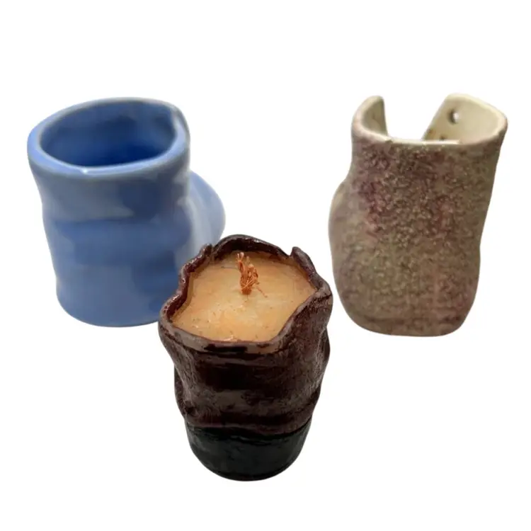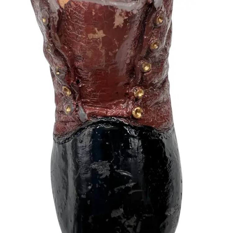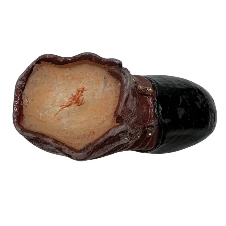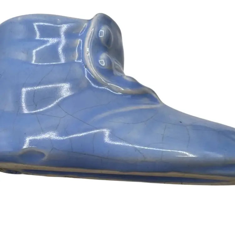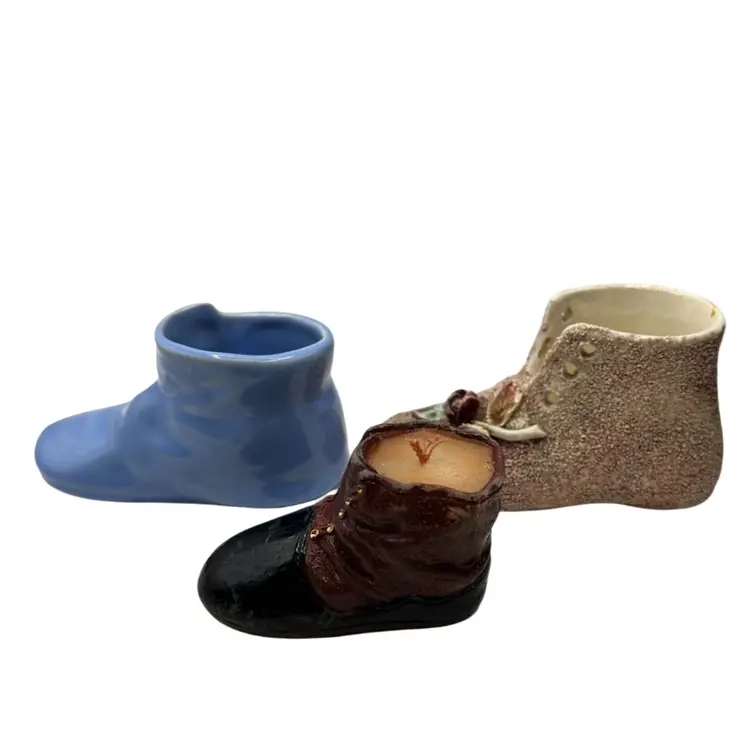 Set of boots 2 little planters and one a candle. Little blue boot has the USA logo on the bottom likely McCoy or Haeger Potteries. It has crazing and one place inside that is chipped see pictures. 2nd is a vintage pottery bootie with decorative leaves and flower in good condition it has one broken leaf as seen in pictures. Very similar to shoe/ boot found in antique shoe book. 3rd is a leather looking bootie that is a candle. Material is likely resin with a glazed finish. Colors are dark brown and black with visible wear on the colors. They are a cute addition to any shoe collection. These would look with a plant in them or just sitting on a table with your other plants.