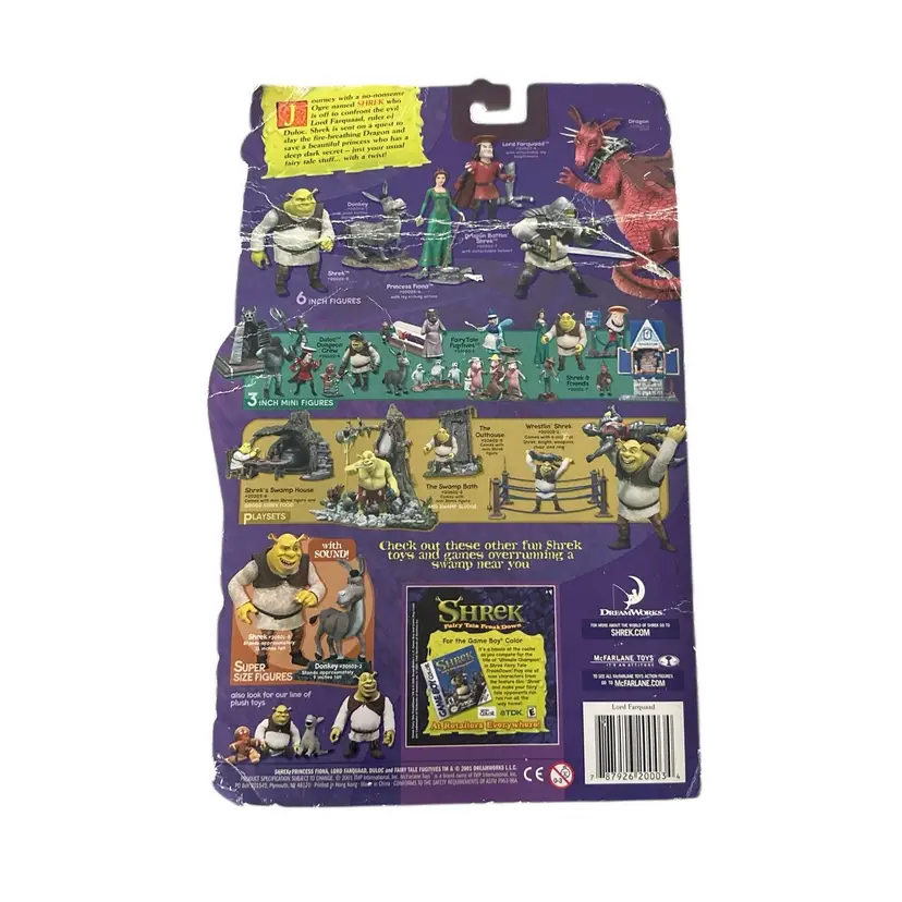 Relive the adventures of Shrek with this Lord Farquaad action figure. Comes with attachable boots for dynamic play. Perfect for collectors and fans of the classic movie. Still in packaging but packaging is worn.