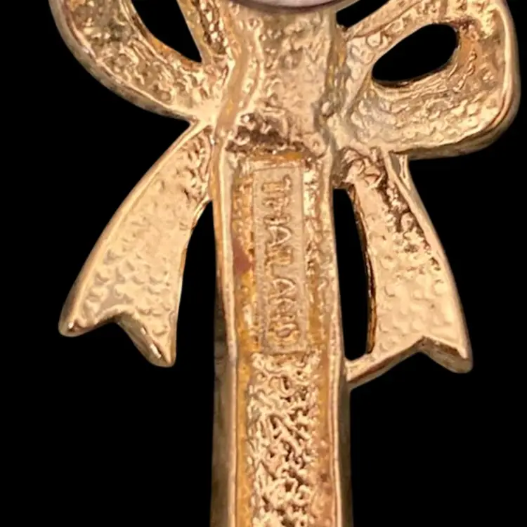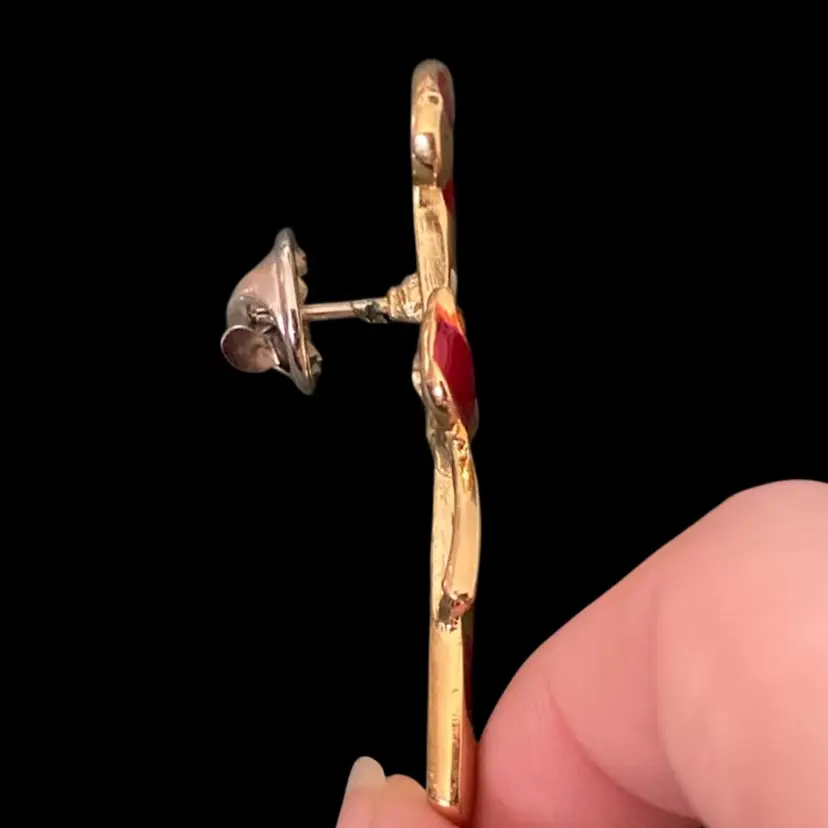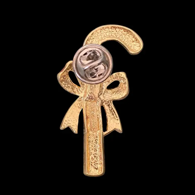 This Signed Thailand candy cane brooch features a festive red and white enamel design on gold-tone metal, perfect for holiday accessorizing. The enamel is in excellent condition with no chips or cracks, making it a charming addition to any jewelry collection. The back of the brooch may not be original, but is still in good condition and works. Jewelry is not tested and all sales are final.