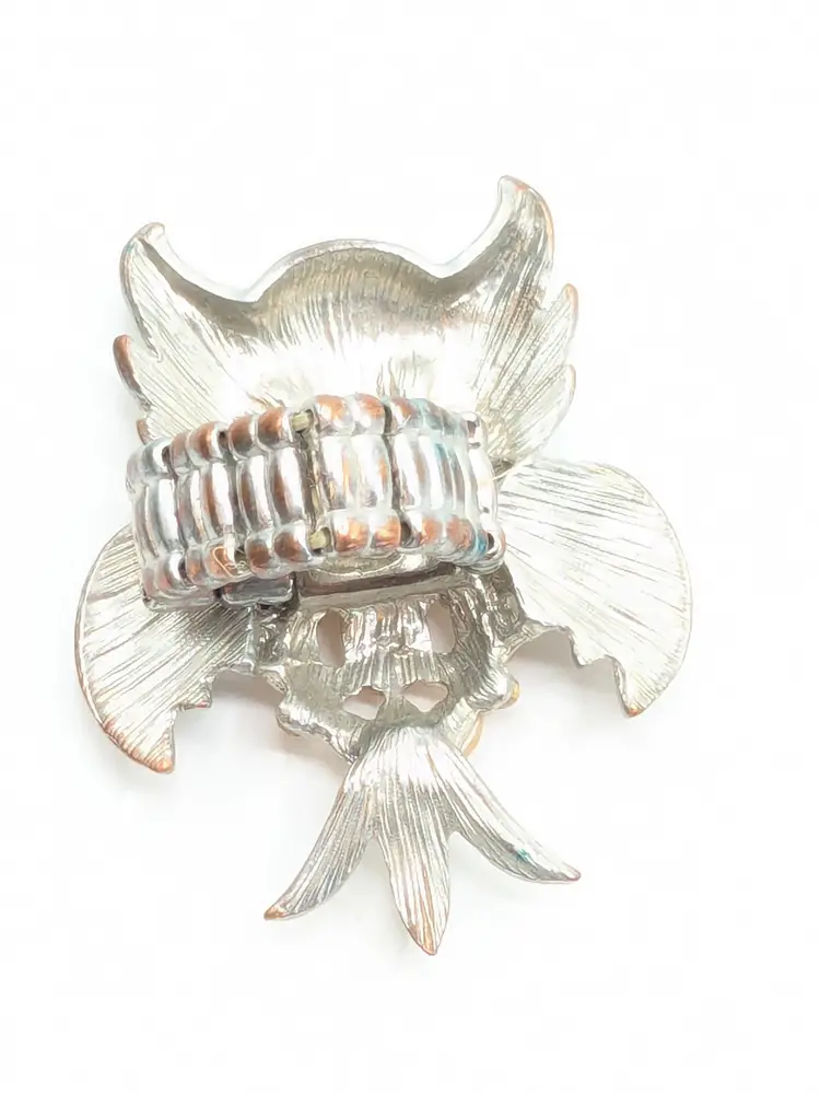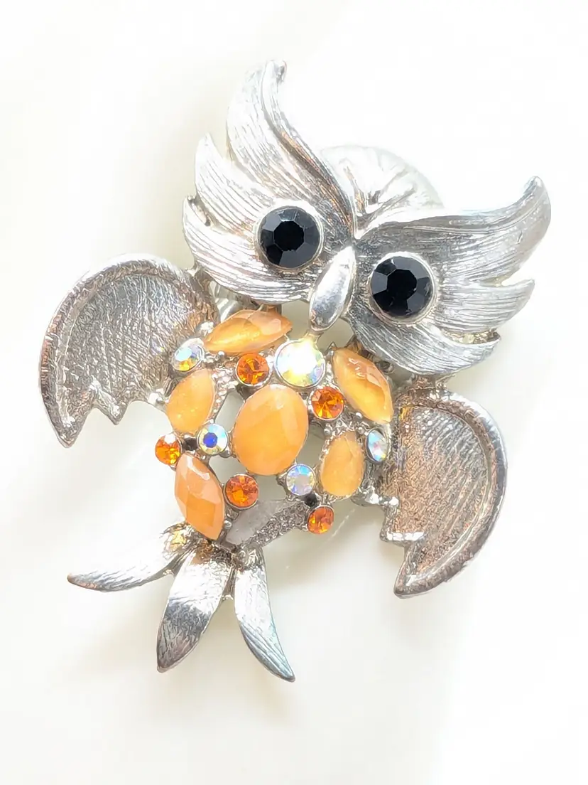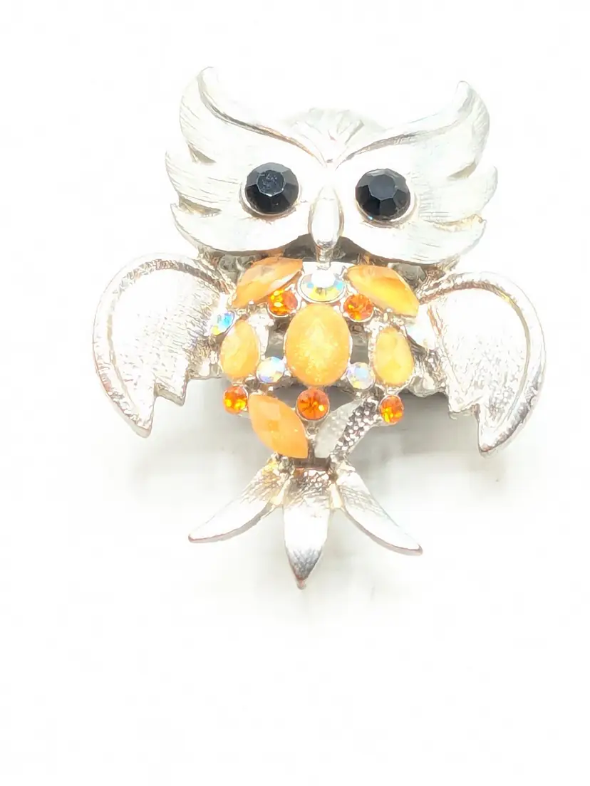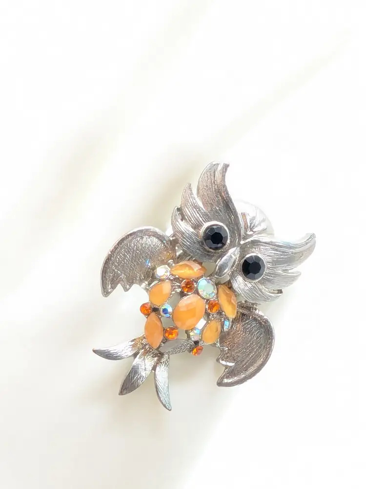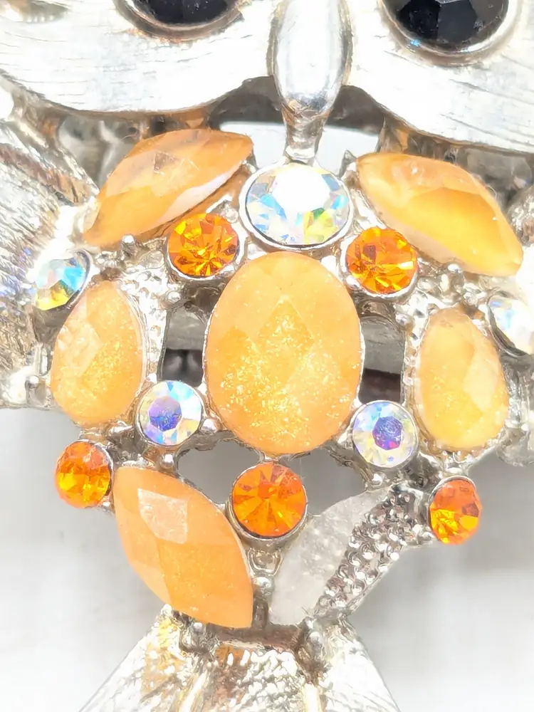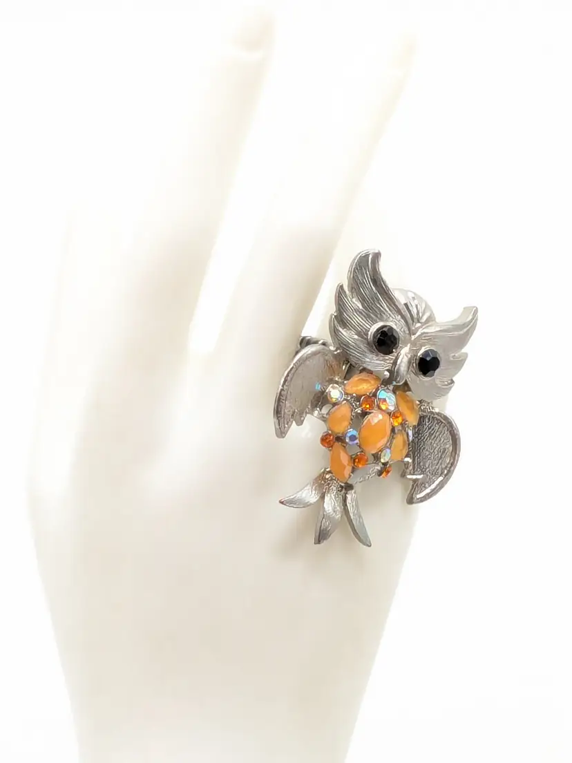 Good condition. Silver tone is bright and shiny with some wear on the back of the band. Features black stone eyes and orange rhinestone belly. Adjustable stretch ring. Sits at a size 7. Owl measures 2 1/8" in length and 1 5/8" wide. (wen)