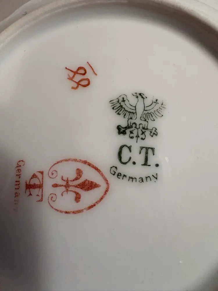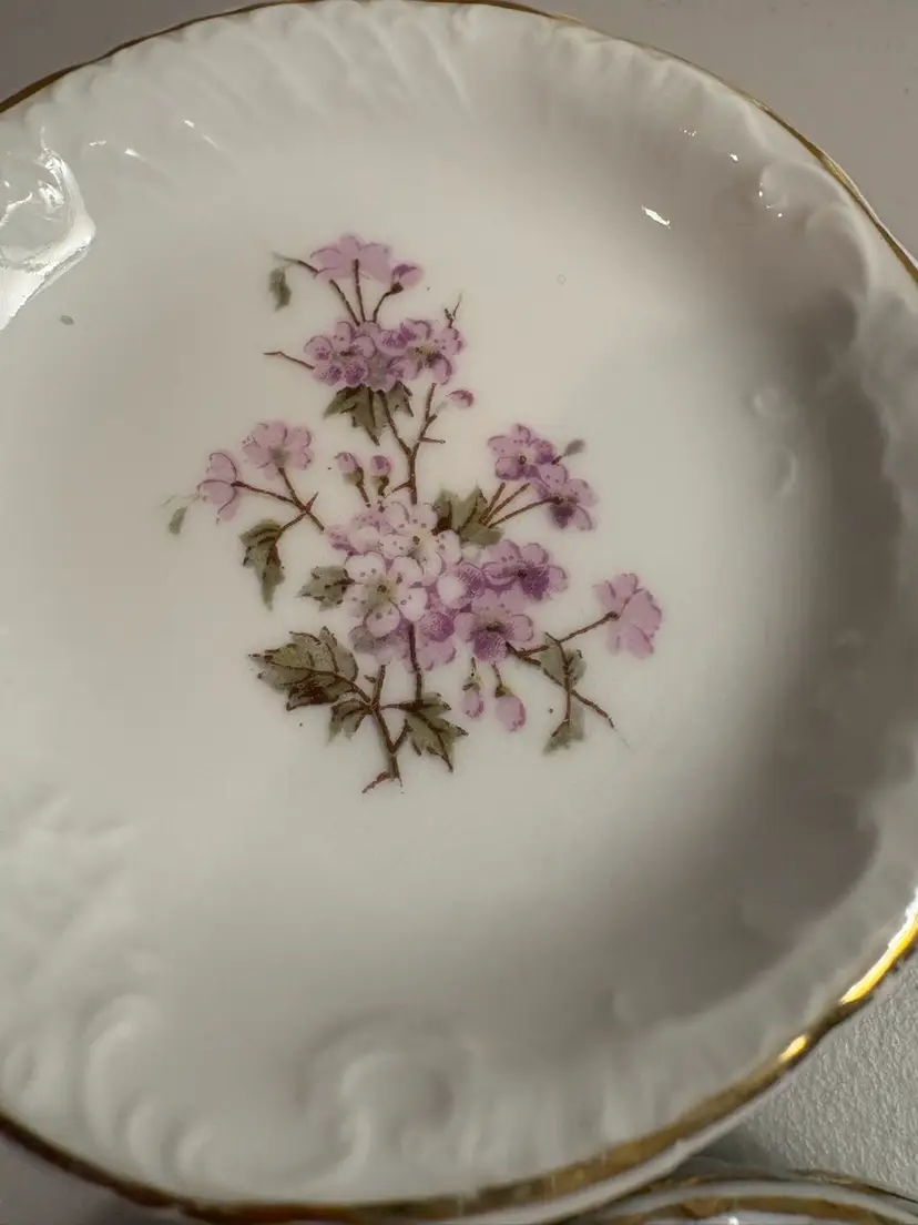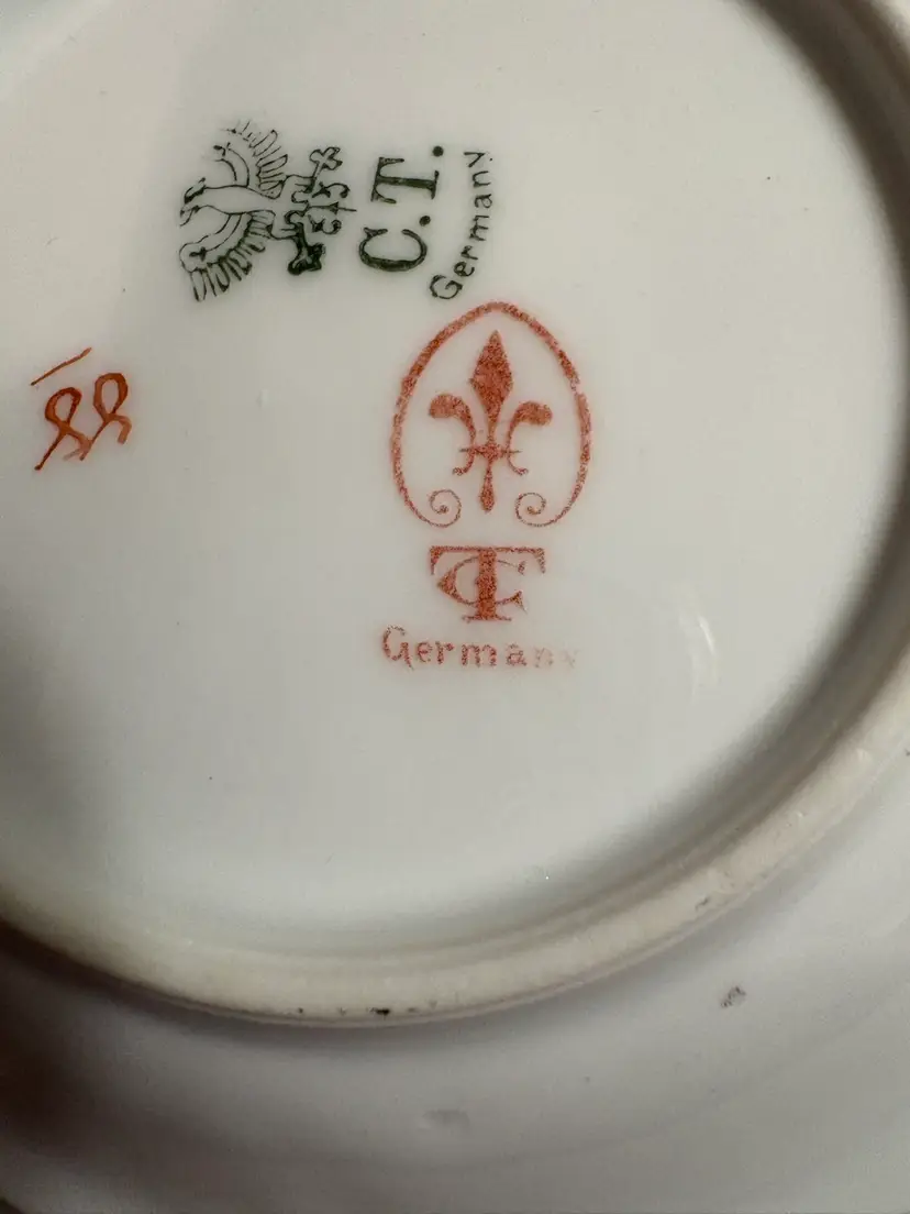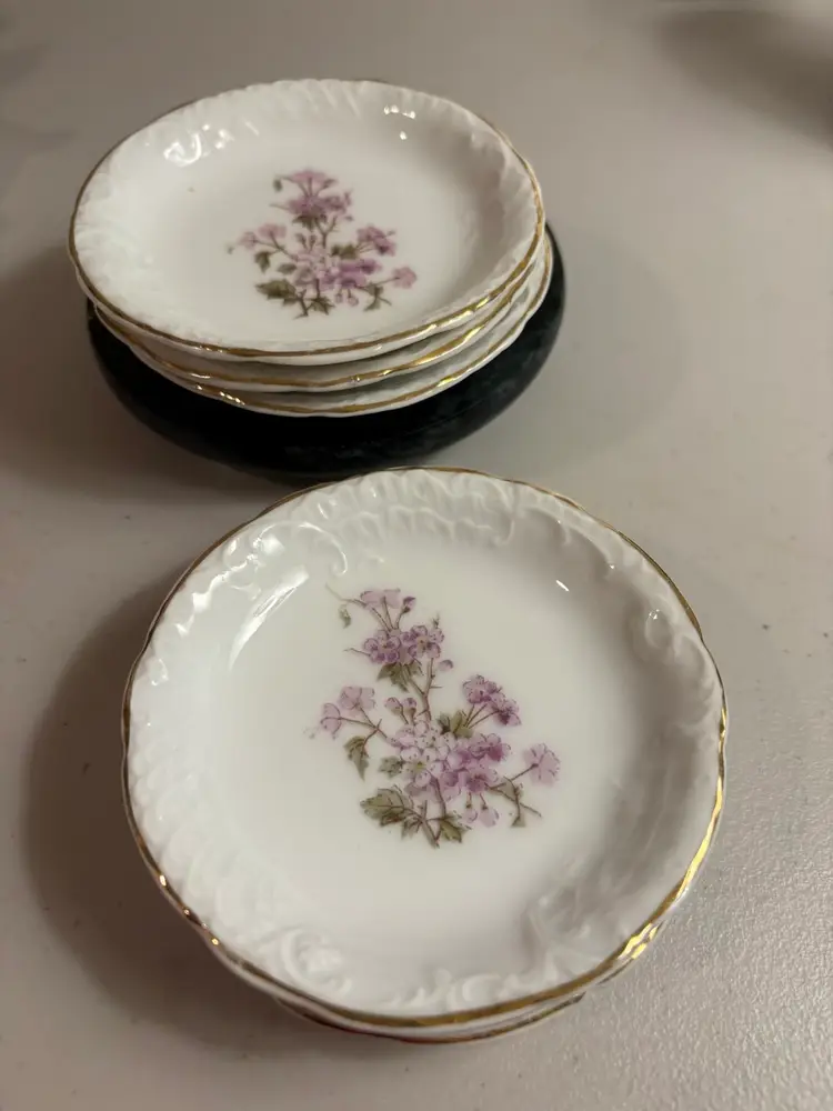 This product is a set of six vintage German floral butter pats, made of porcelain. The butter pats feature a small size and a floral pattern, making them a charming addition to any kitchen or dining room. Each piece showcases the intricate craftsmanship and unique design typical of German dinnerware, adding a touch of nostalgia and elegance to your table setting. Perfect for collectors or those looking to add a vintage touch to their home decor.
