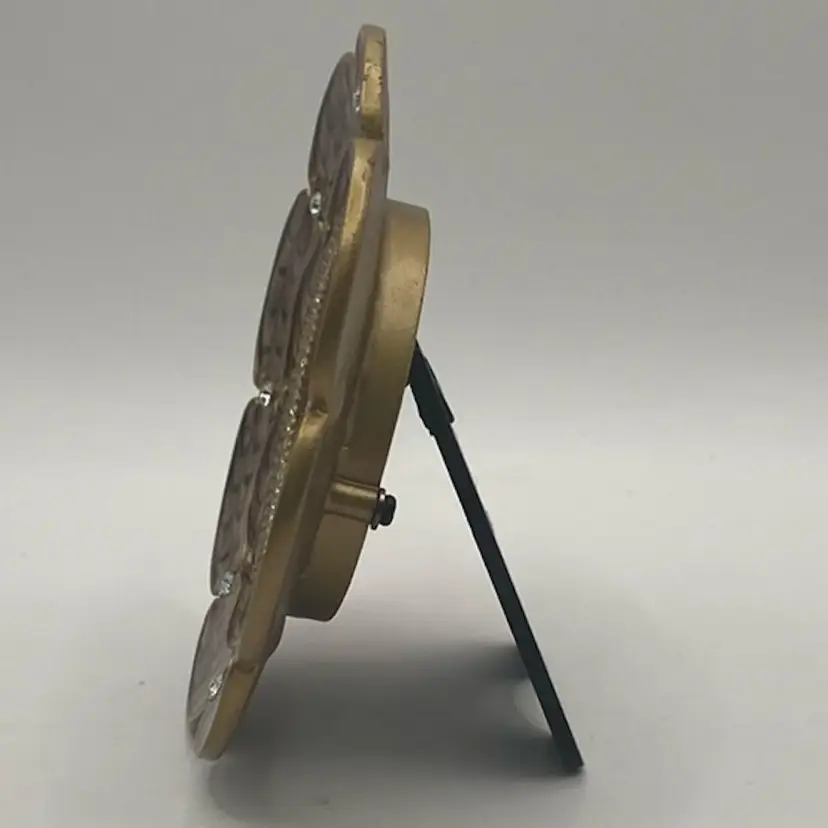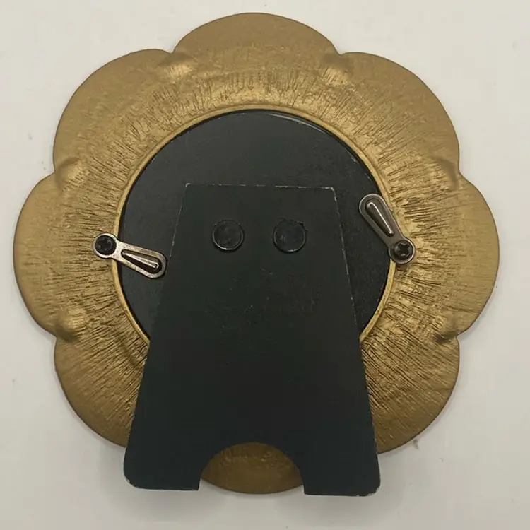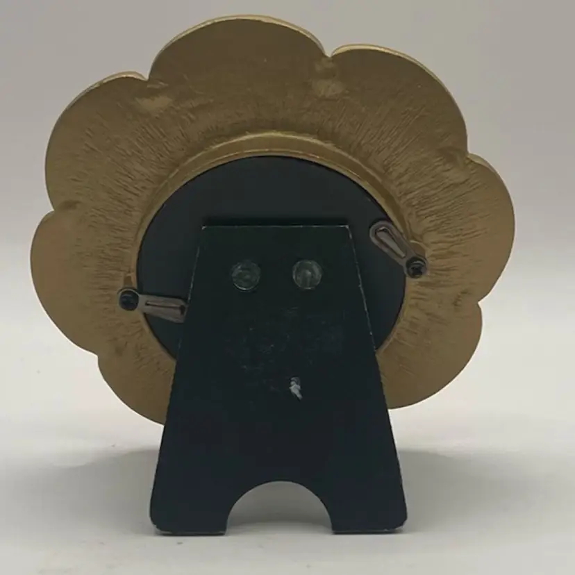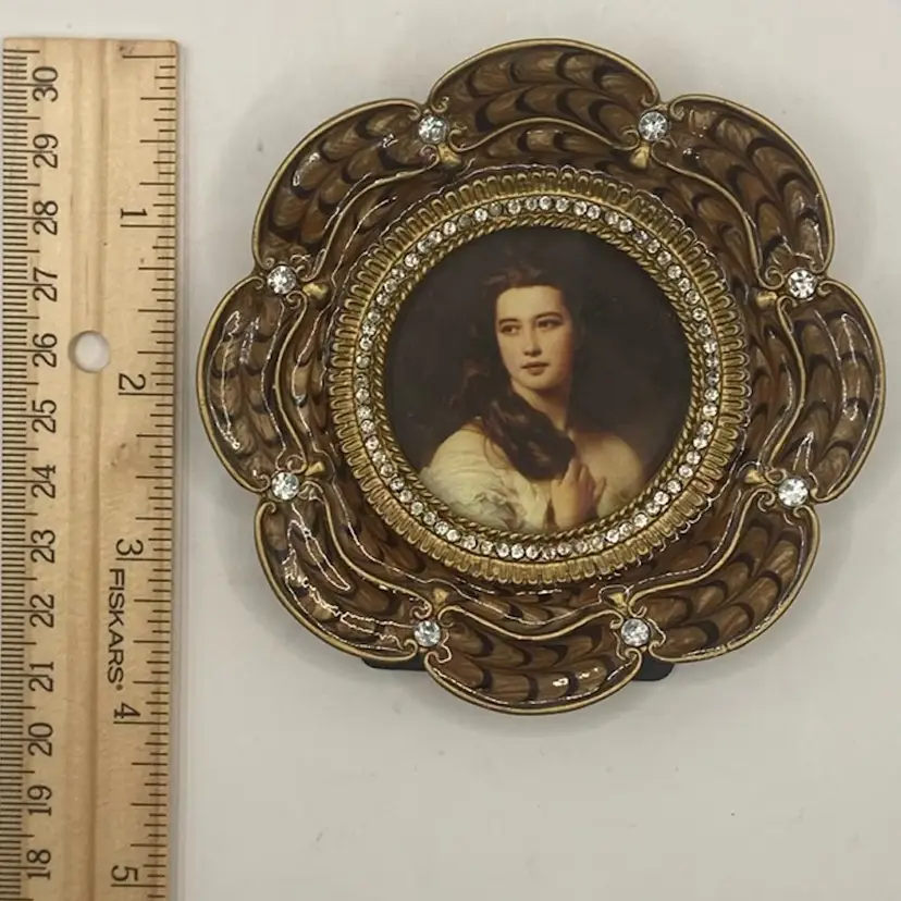 This little frame is so good. It has a swirled, brown, enameled, and scalloped edge with large rhinestones. In the center it has smaller rhinestones all the way around the frame opening. They are not marked or branded, but are heavy for their size. See all photos.
