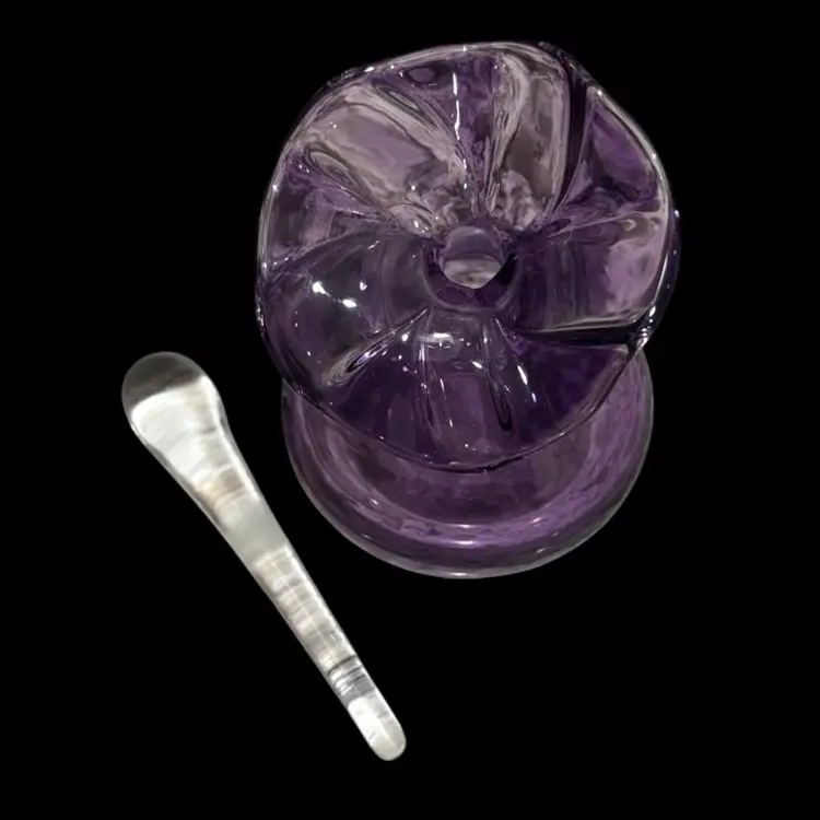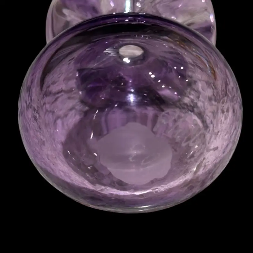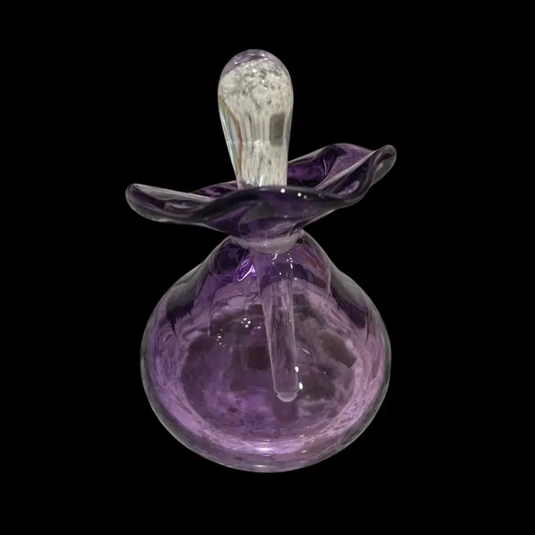 Lovely small purple art glass perfume bottle, signed by artist. No chips or cracks, had perfume in it at some point as scent still noticeable. 2x2.5”