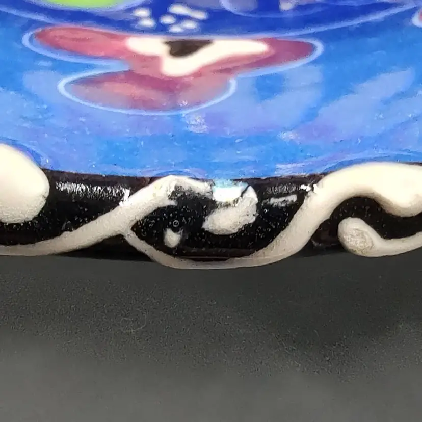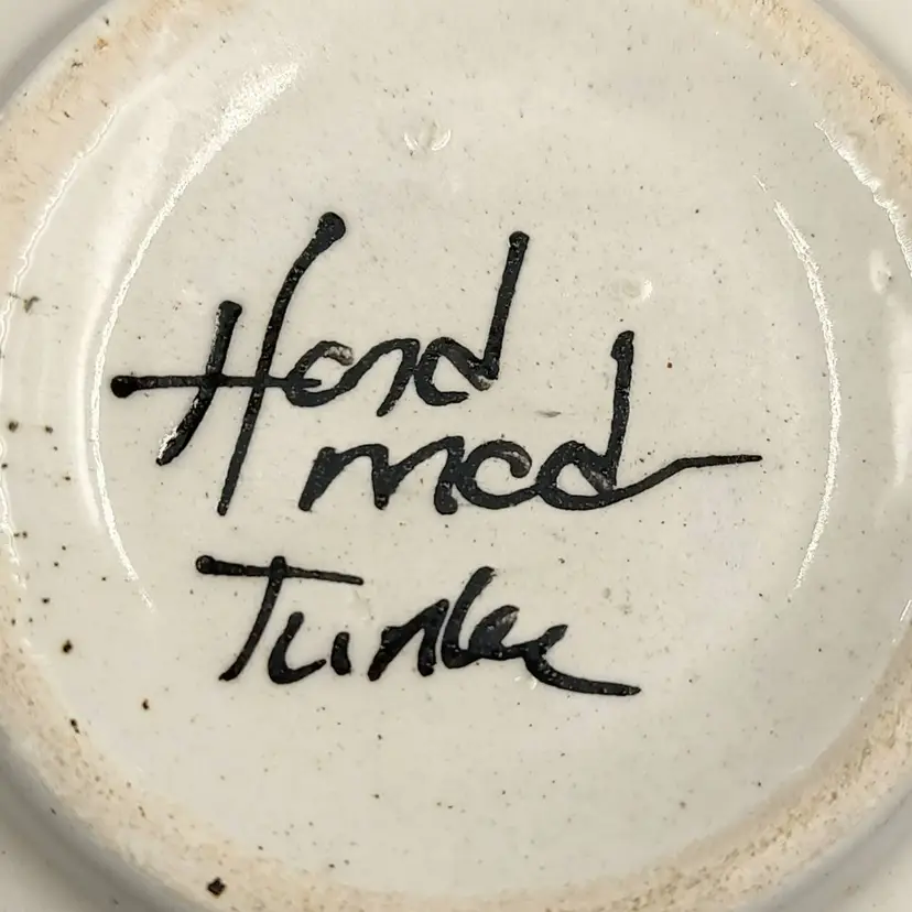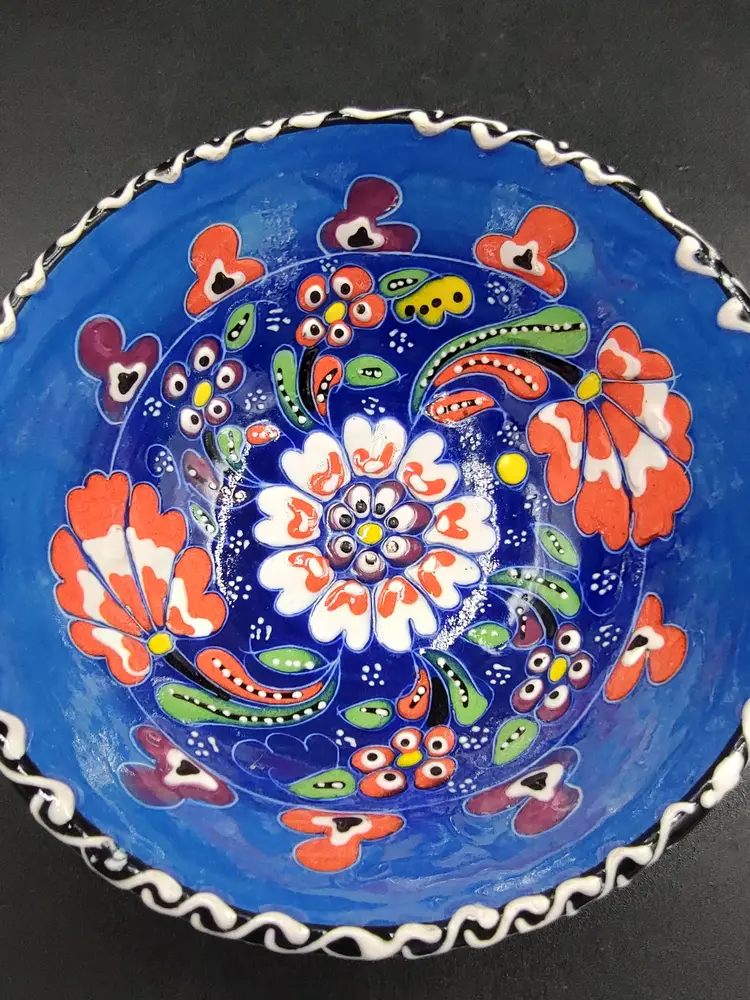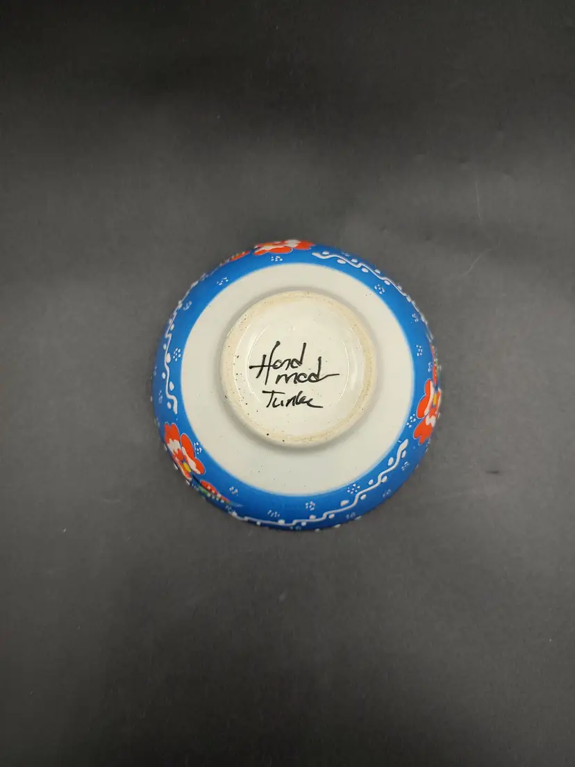 Small Hand Made Ceramic Trinket Bowl. Iznik design height 2" x diameter 5". Item has flea chipping to rim as shown in pictures. Made in Turkey