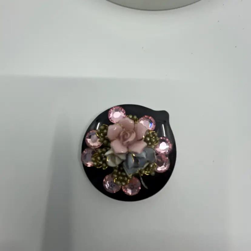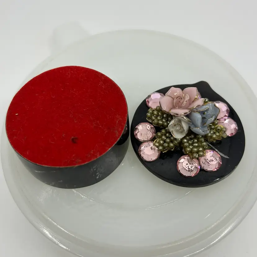 Small Metal Interior Black Stone Exterior Trinket Box Adorned W Pink Rhinestones, Beads, And Porcelain Flowers