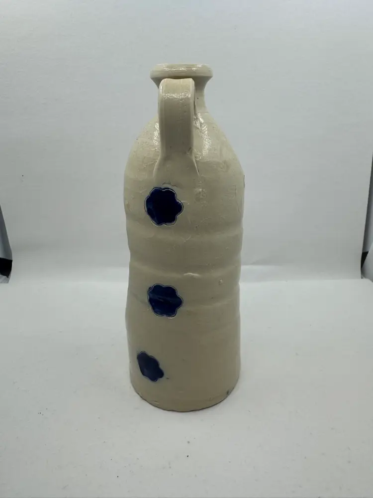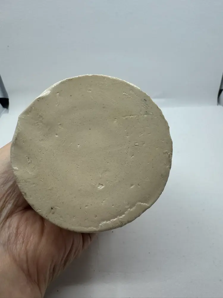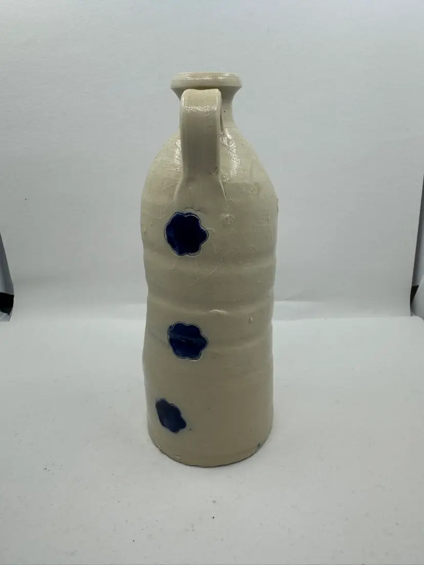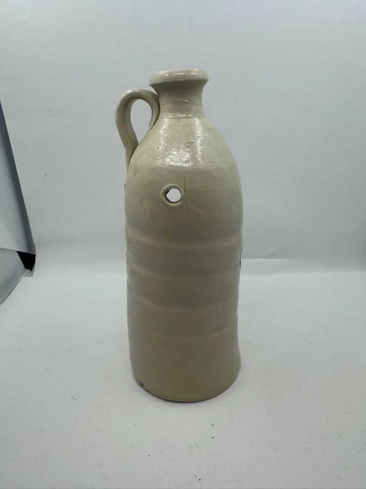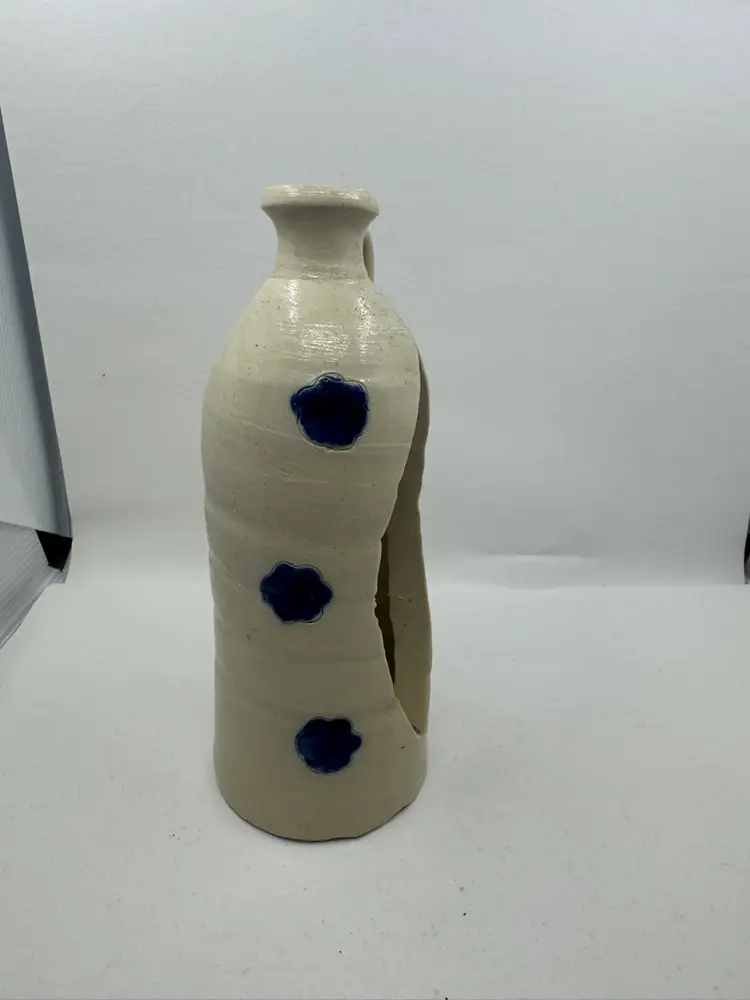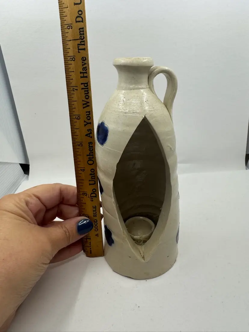 Speckled stoneware jug with cobalt blue dots and cutout candle holder