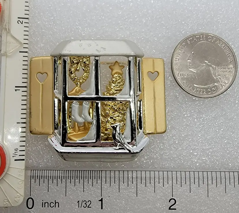 This vintage St. Nicolas Square Christmas Window Scene Brooch is an Old/New piece on the original card. Features a 3-Dimensional window with gold-tone Christmas ornaments on each window panel. Measure approximately 2-inch wide and 1.75-inch high.
