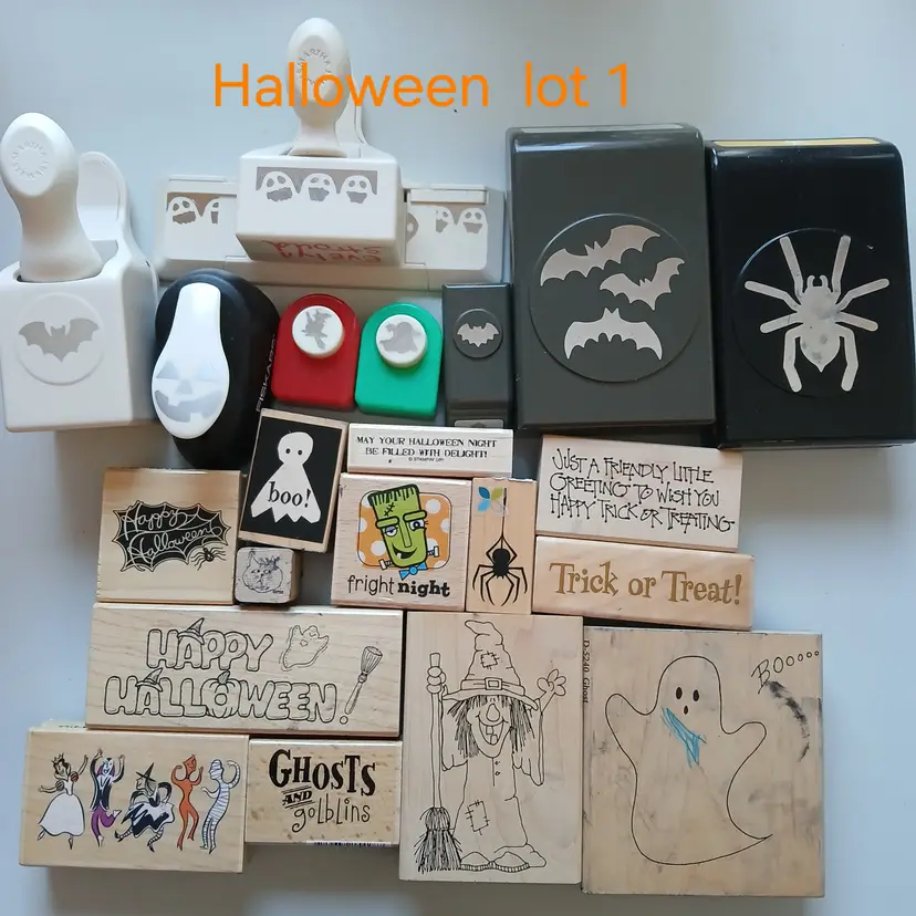 Halloween Assorted 12 stamps and 8 punches . Bats, ghosts, witches, sayings,