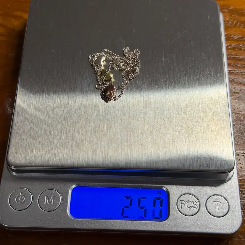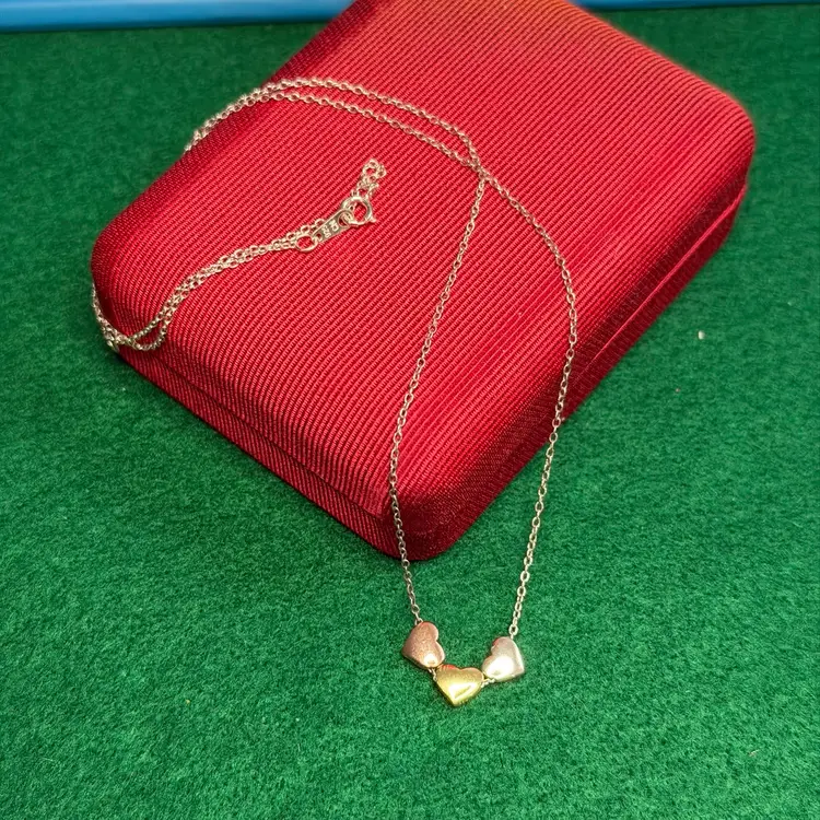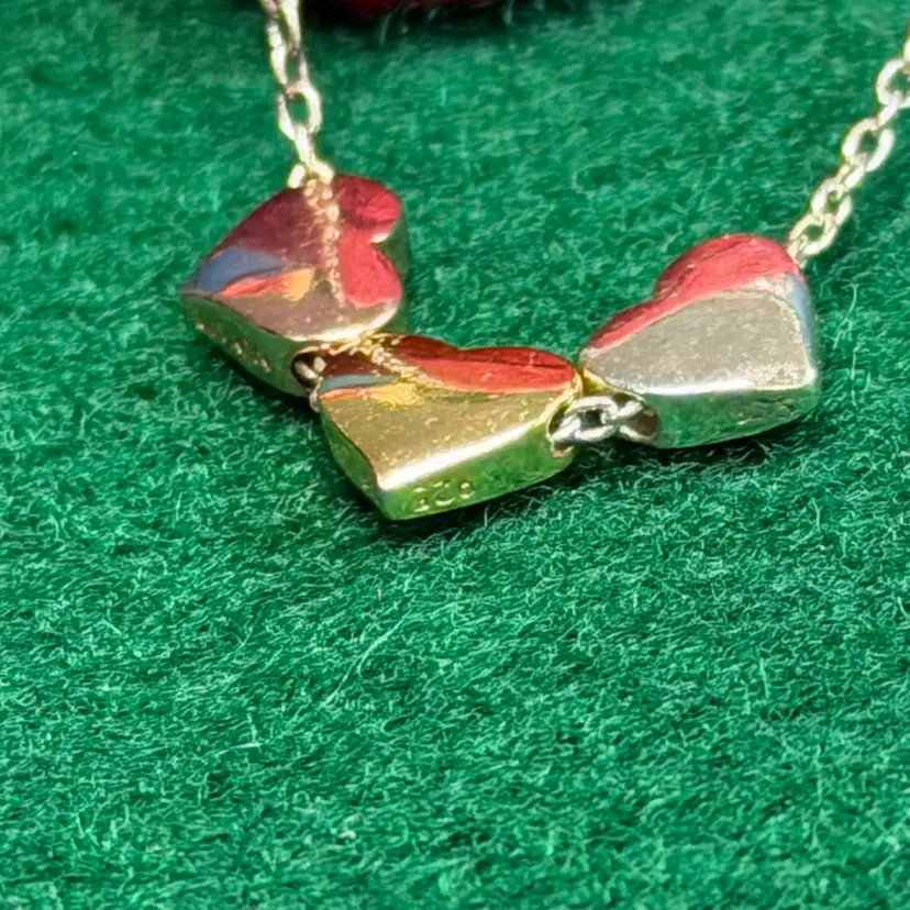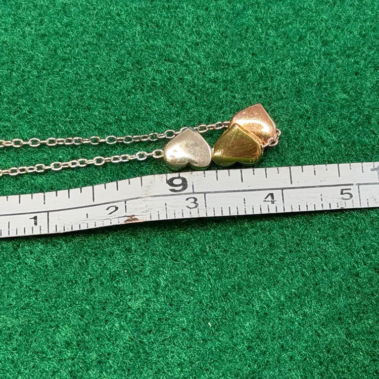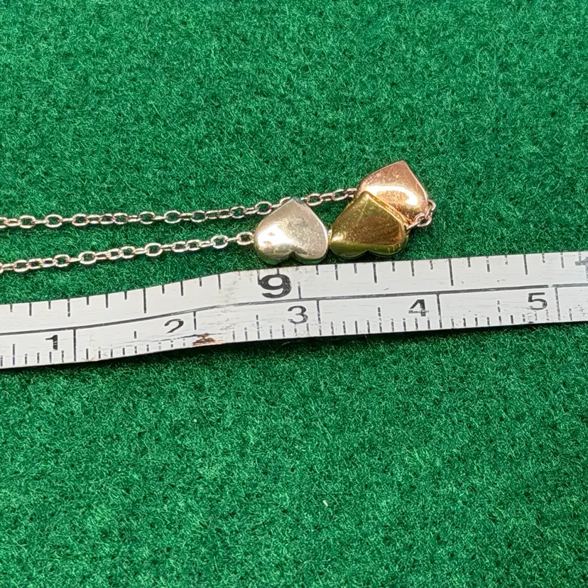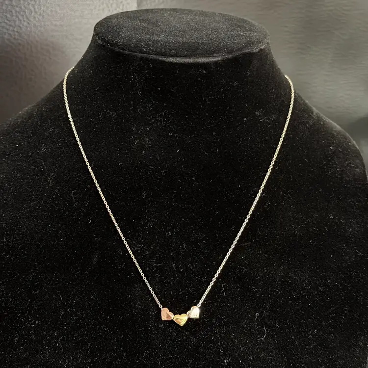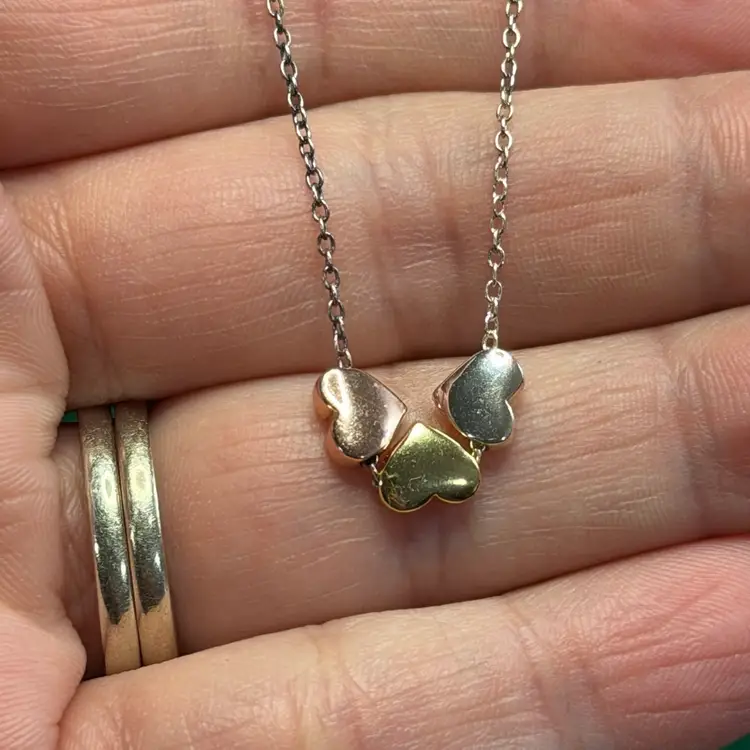 This adorable necklace has three hearts all marked and tested 925 silver. One of the hearts is silver, one silver washed with yellow gold and the last is silver washed with rose gold. The chain is also marked and tested and is about 19 inches long.