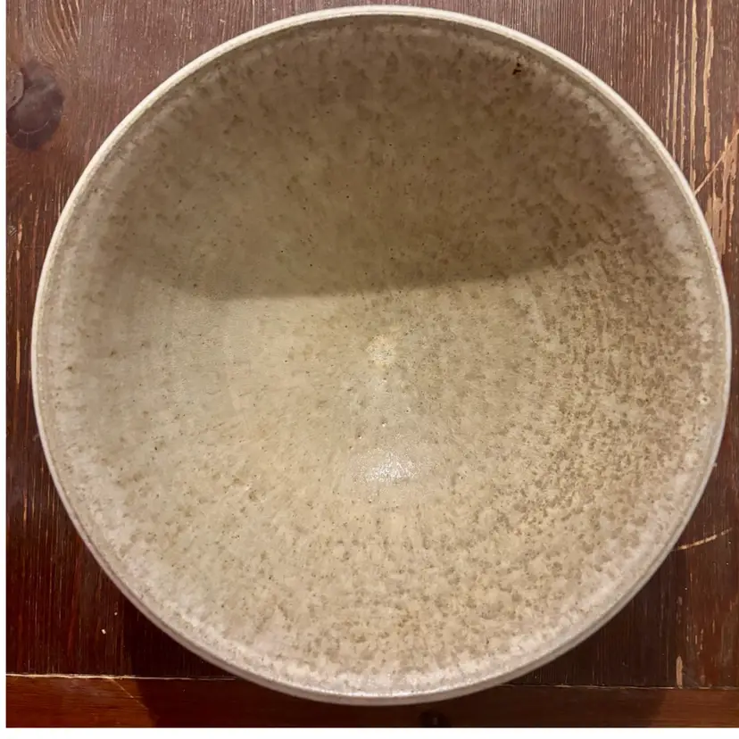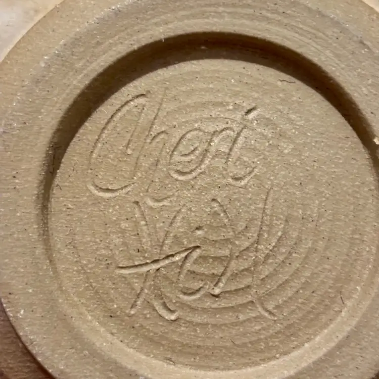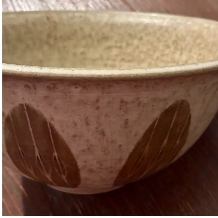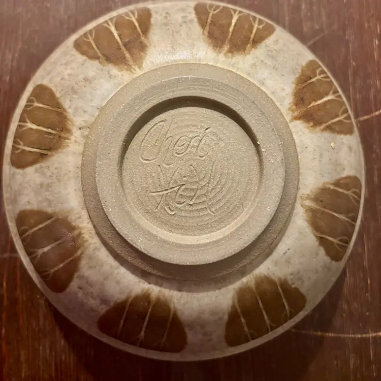 Approx. 11”x 5” Vintage stoneware studio pottery bowl signed by the artist Cheri Hill The signature "Cheri Hill" is visible on the unglazed bottom of the bowl This type of pottery is characterized by the wheel-thrown, organic shape It features a warm, neutral-colored glaze with a pattern of brown leaf like shapes around the outside Absolutely no flaws that I can see or feel No cracks, chips or breaks Beautiful Studio Pottery Hand Made,Artist Signed Large Bowl!