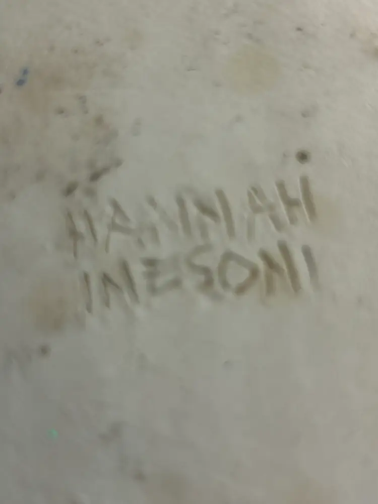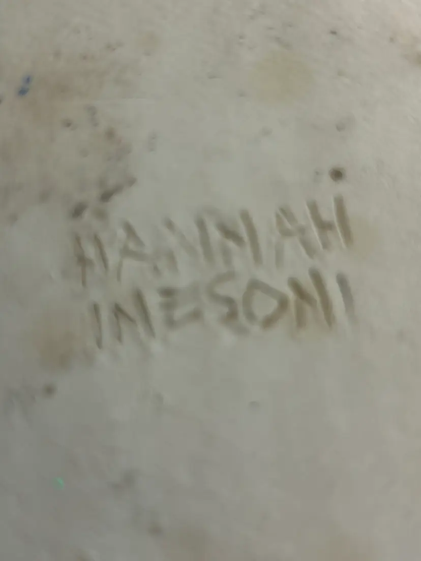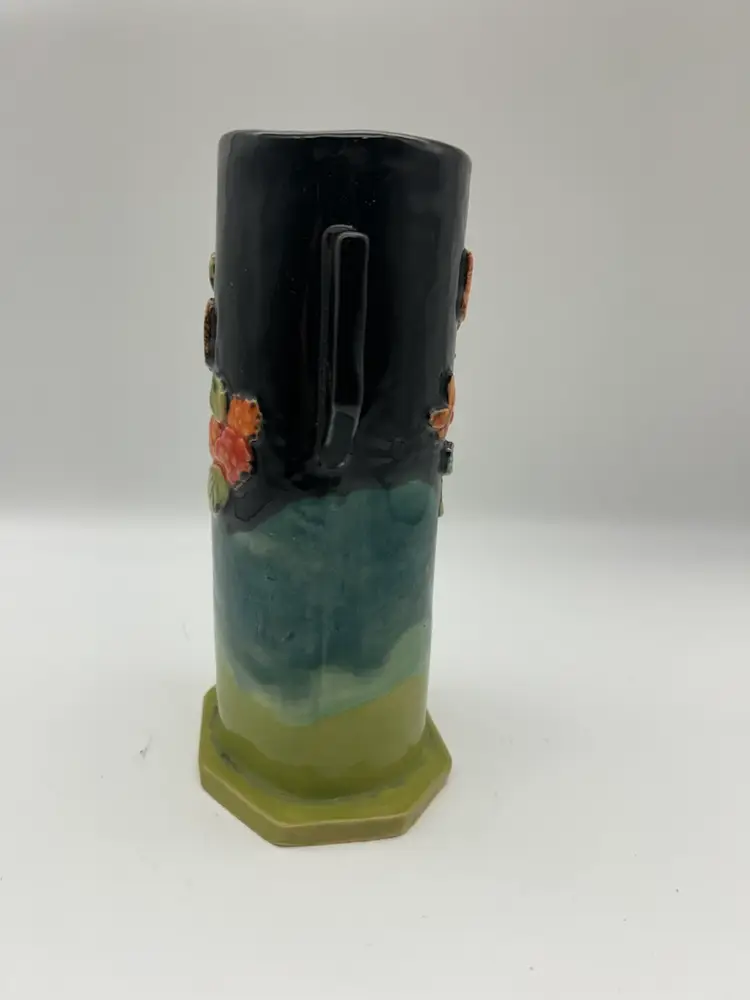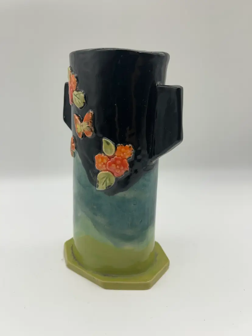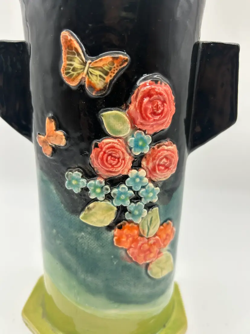 This two handled vase is adorned with raised flowers and butterflies. Hand painted, applied floral and glazed in black blue/green and then olive green. This has been signed by the artist. It is approximately 8” tall and 4 1/2” wide.
