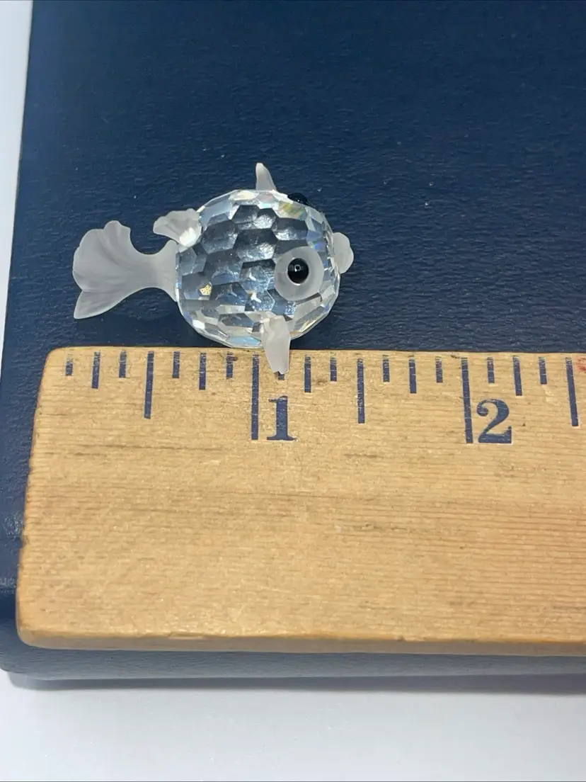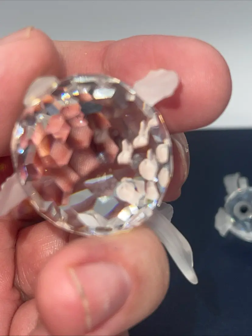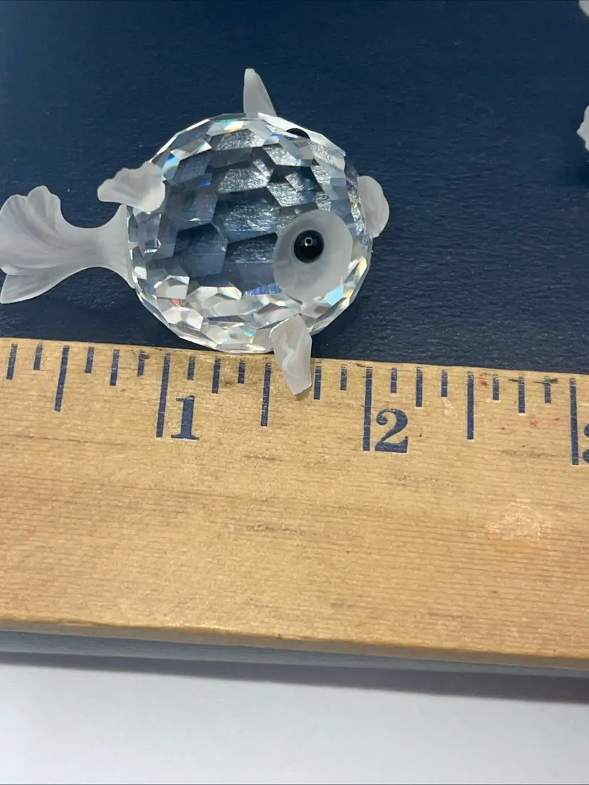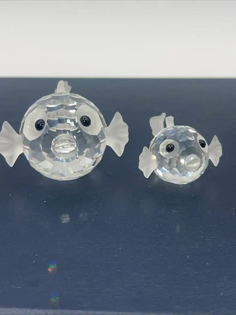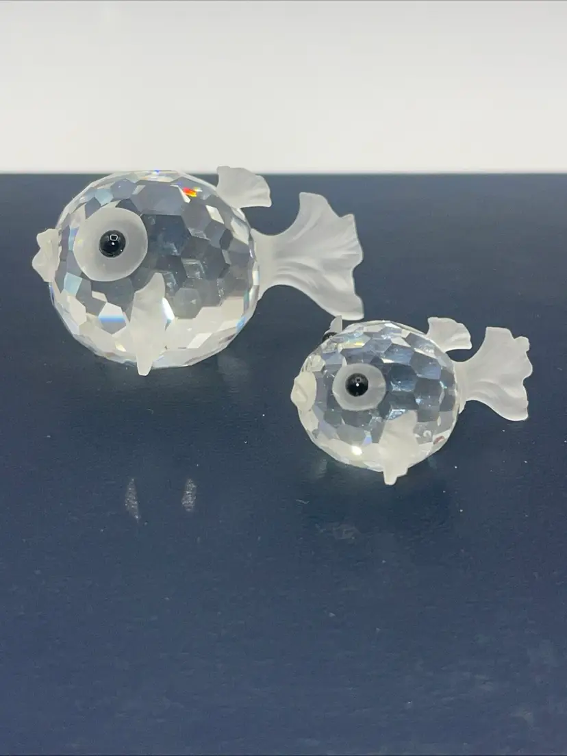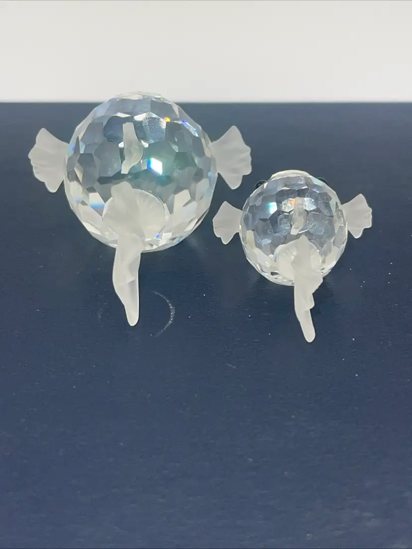 This is a bundle deal for two puffer fish by Swarovski crystal. The large one is 2 inches. The smaller one is 1.5 inches. They do have the swan itching on them. There is no damage. I do not have the original box but they will be packaged for safe shipment thank you for looking and please see my others Swarovski listings
