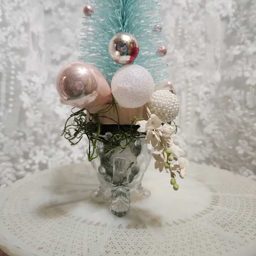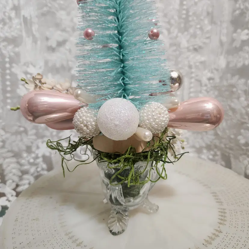 A gorgeous mix of sparkling pink and teal in this bottle brush tree assemblage. The surrounded by pink and white ornaments. Tucked in are vintage lily of the valley millinery stems. There are also vintage glass ornaments. This would fit a shabby chic springtime display so perfectly.