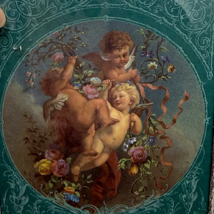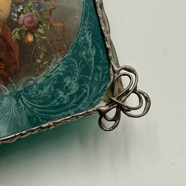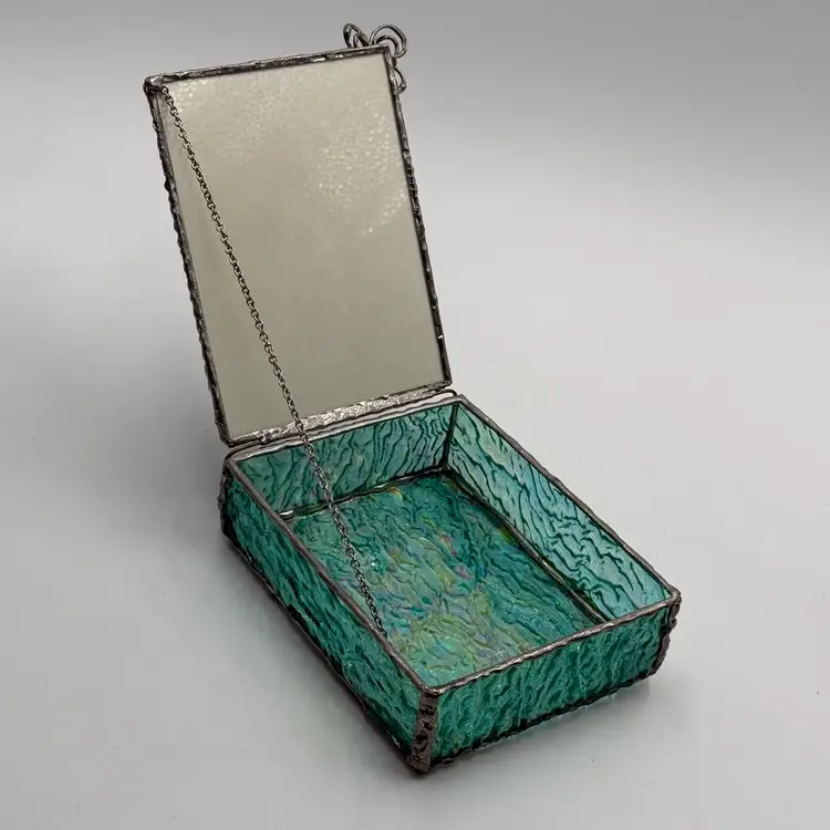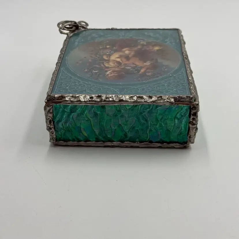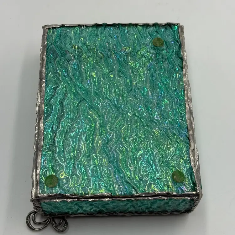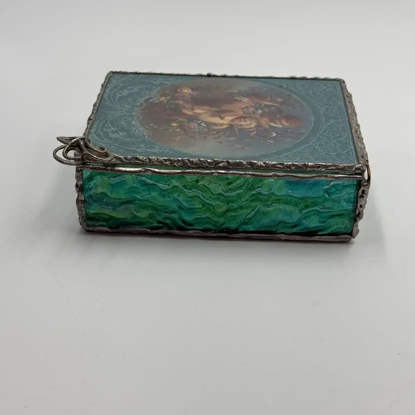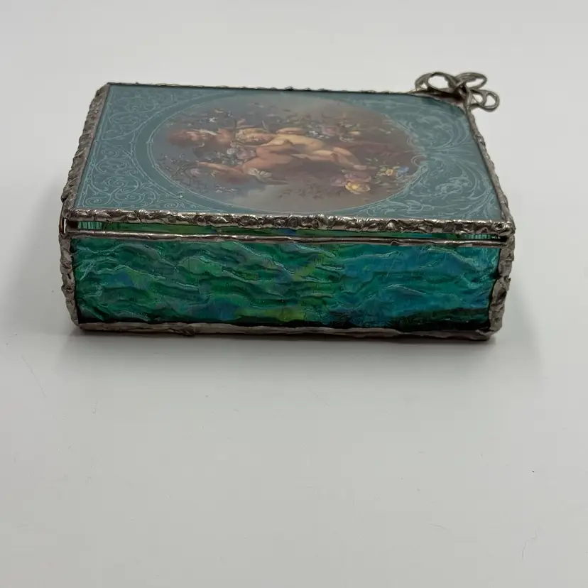 This beautiful Teal Iridescent Colored Glass Cherub Jewelry Keepsake Storage Box With Chained Lid is perfect for storing your precious jewelry and trinkets. The rectangular shaped box measures 6 inches in length and 5 inches in width and features a stunning teal color that will complement any room decor. The box is made of high-quality glass material and comes with a chained lid, making it easy to open and close. Condition is used but in good condition. Does not have any chips or cracks. The lid does move back and forth on the hinge.