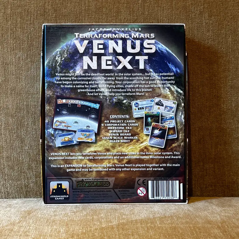 Terraforming Mars: Venus Next, the second expansion for the Terraforming Mars base game, has players building flying cities and making the atmosphere more hospitable on the deadly planet Venus. In Venus Next, the World Government chooses to also fund the terraforming of Venus. Around 50 project cards and 5 corporations are added, with a special focus on how to make Venus habitable. With the new floater resource, a new milestone, a new award, a new tag, and a new terraforming parameter, players are given more paths to victory and an even more varied play.
