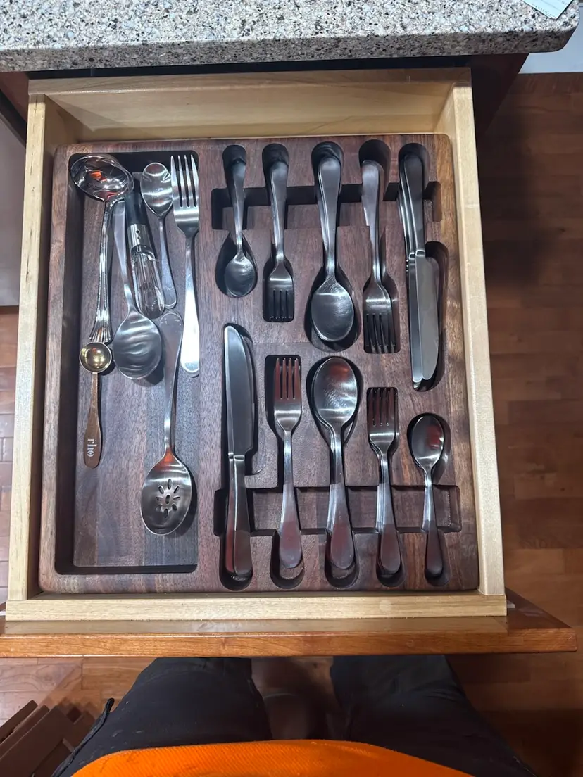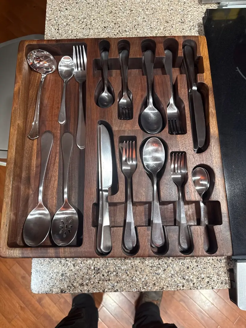 This handmade black walnut silverware organizer is built to bring order, warmth, and craftsmanship into your kitchen drawer. Precision-machined from solid walnut and hand-finished, it’s designed to securely cradle each piece of flatware while showcasing the natural beauty of the wood grain.
